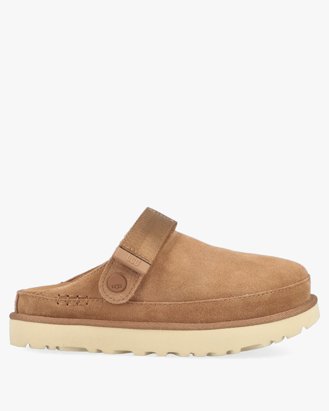 Ugg Goldenstar Clog in suede with a memory foam sheepskin insole and an elastic strap that can be worn over the heel or instep. Beige micro rubber sole.