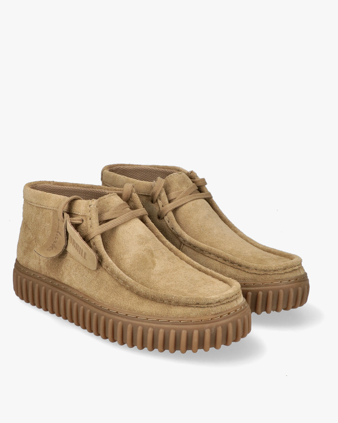 Clarks Torhill Dark Sand Women's Model - Revisited Ikonic Style Ikonic Design: Ankle boot model that recalls the classic Wallabee, with a distinctive moccasin toe. High Quality Material: Made of soft suede in Dark Sand (dark sand/camel). Sturdy Platform Sole: Featuring a thick, ribbed rubber lug sole in a coordinating color, which gives a contemporary look and greater grip. Original Details: They feature the iconic Clarks Originals tag and a second tag with the word TORHILL on the laces. Comfort and Versatility: Perfect for a casual yet sophisticated look, offering comfort thanks to the low ankle boot fit. Closure: Tone-on-tone laces.