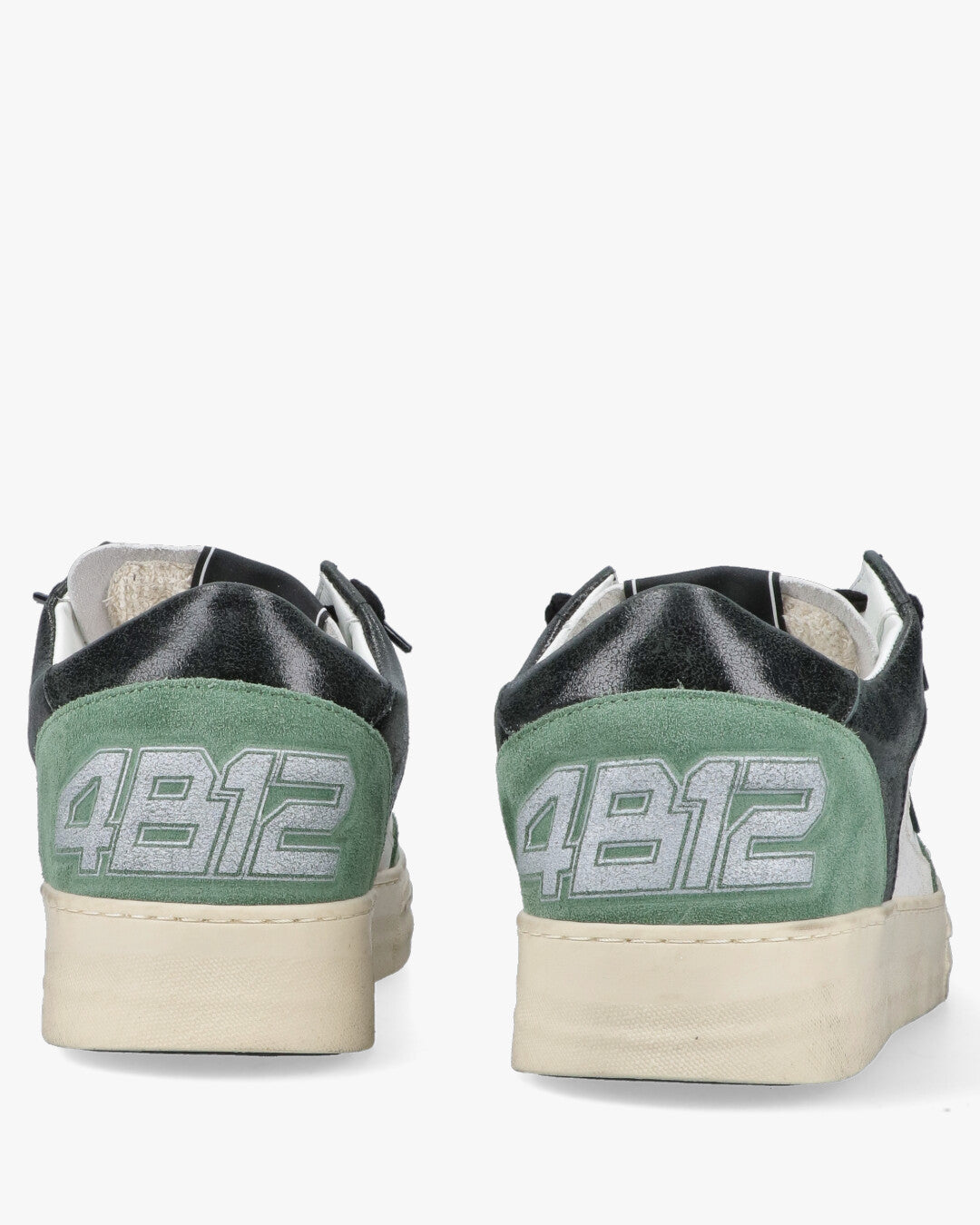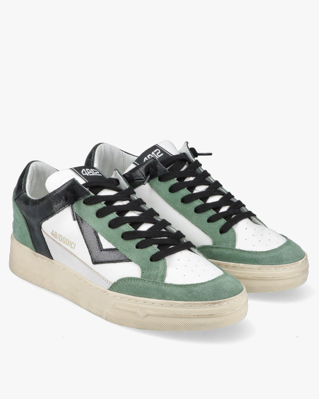 Model: U113Brand: 4B12 / Quattro DodiciColor: Green, Black and WhiteOuter material: leather and suedeLining: leather and breathable fabricSole: vintage-effect rubberClosure: black lacesDetails: 4B12 logo embroidered on the heel, gold side writingStyle: casual, urban, sporty retro