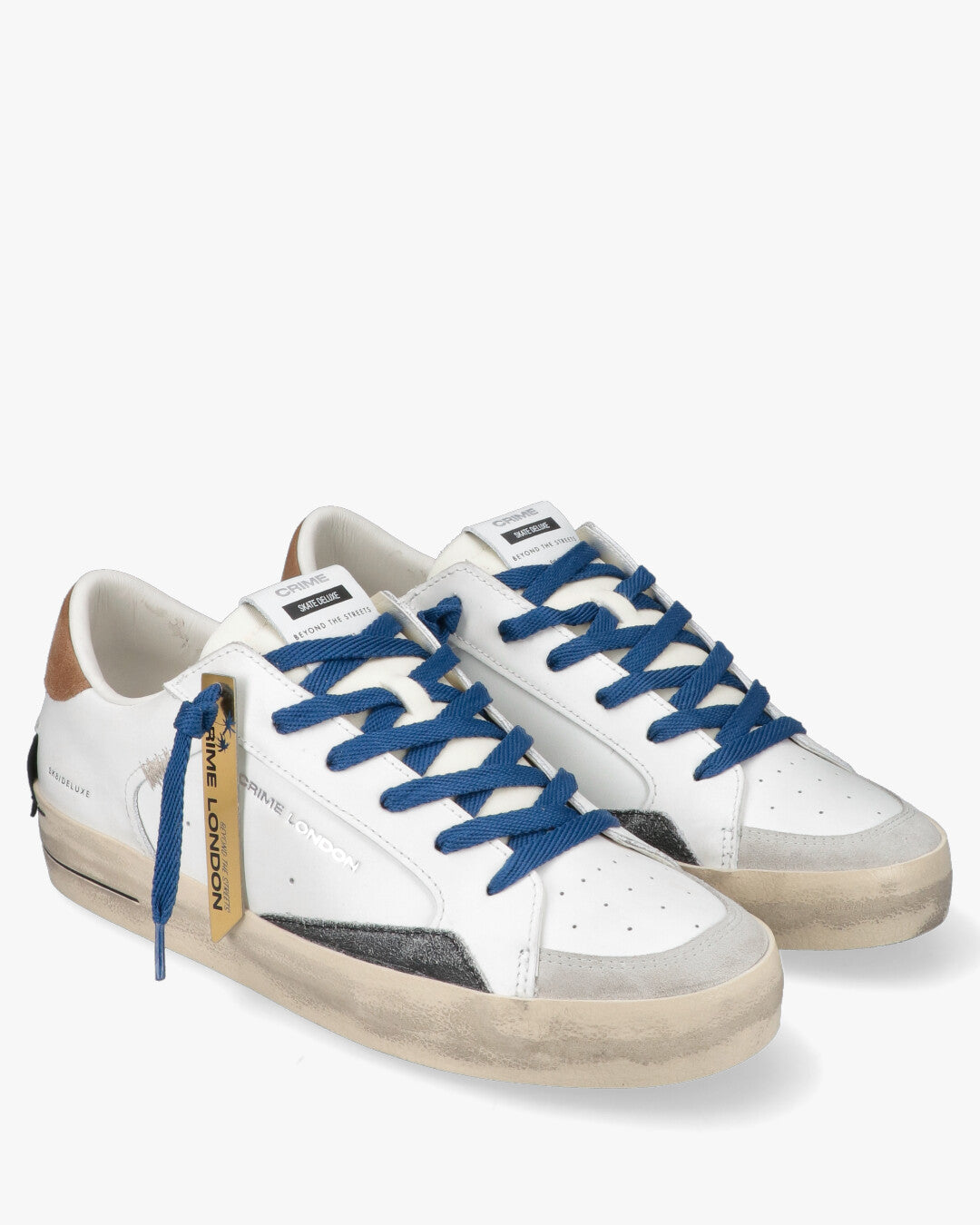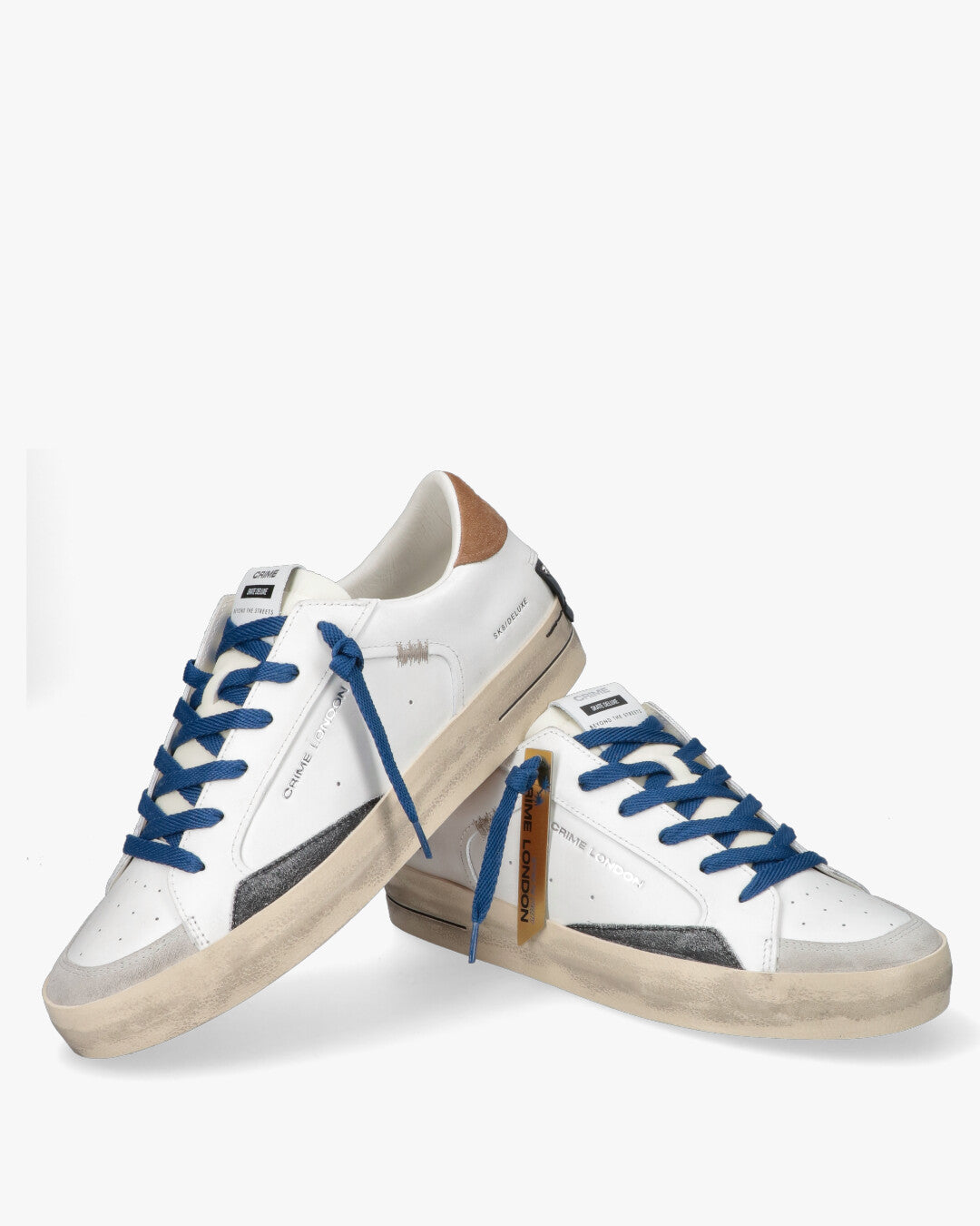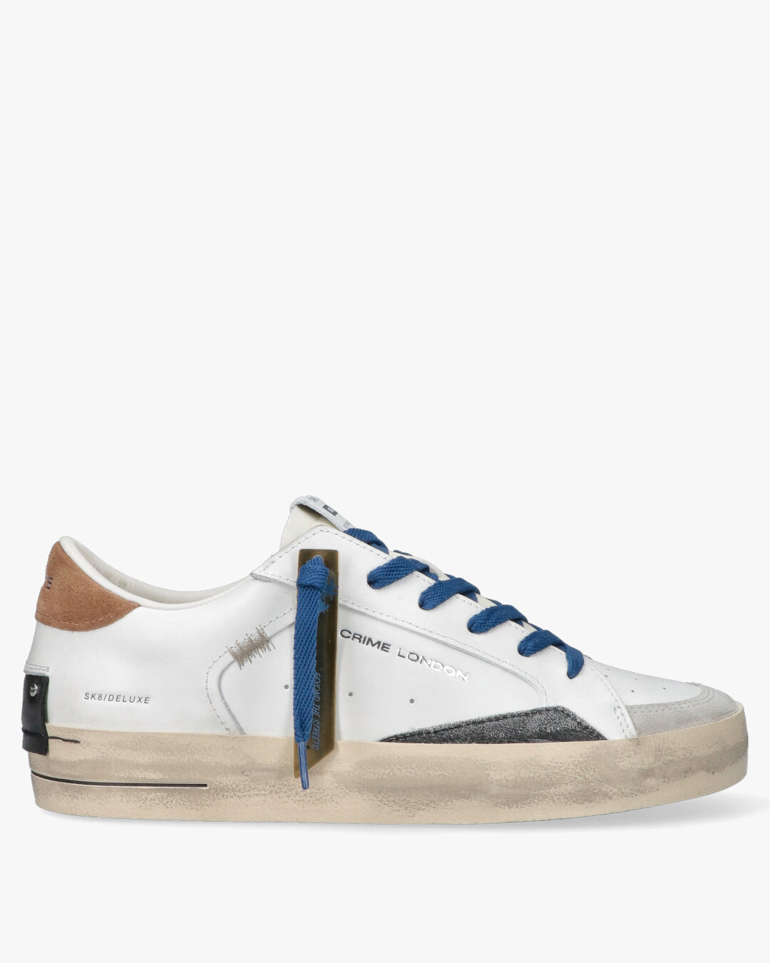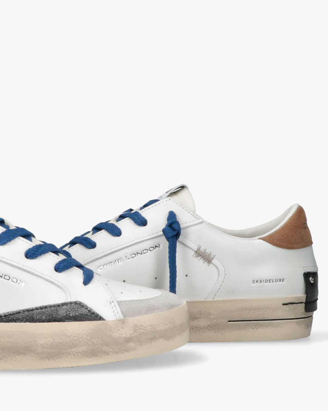 Crime London - Sk8 Deluxe WhiteLe sneaker Sk8 Deluxe di Crime London fondono estetica urban e dettagli artigianali. Caratterizzate da una tomaia in pelle bianca con finitura distressed, queste scarpe presentano un mix ricercato di texture, inclusi inserti in suede grigio sulla punta e un talloncino in pelle scamosciata color tabacco. Il design è completato da lacci piatti blu a contrasto e un dettaglio tecnico sul tallone con borchie piatte.Dettagli del prodottoTomaia: Pelle di alta qualità con effetto vissutoDettagli: Inserti in suede e linguetta logataChiusura: Lacci in cotone bluSuola: Gomma preformata con finitura vintageInterno: Fodera morbida per il massimo comfort quotidianoPerfette per un look casual ma ricercato, si abbinano idealmente a denim denim o pantaloni chino.