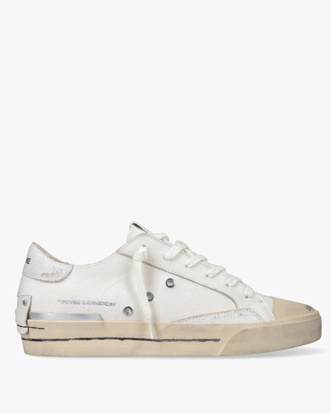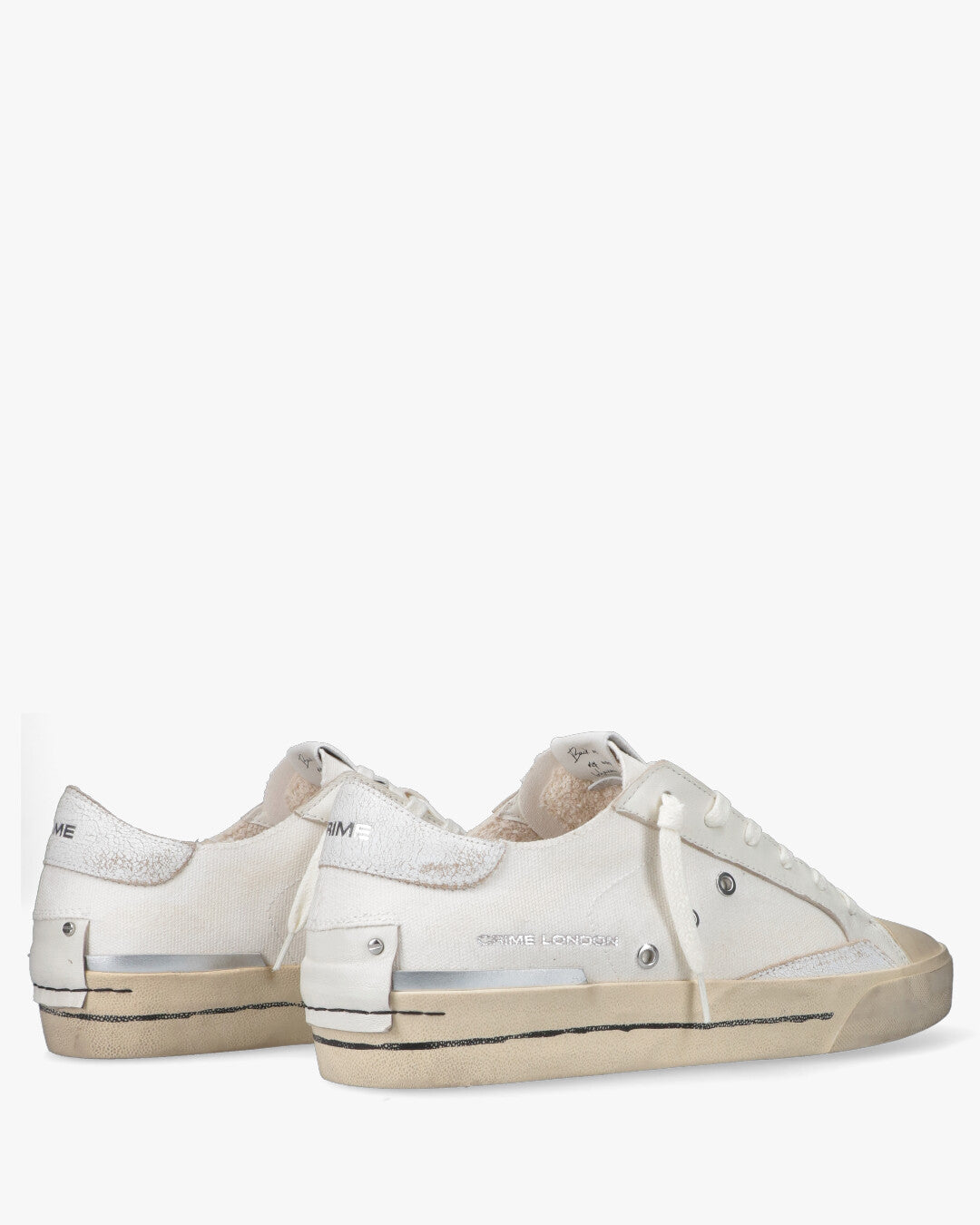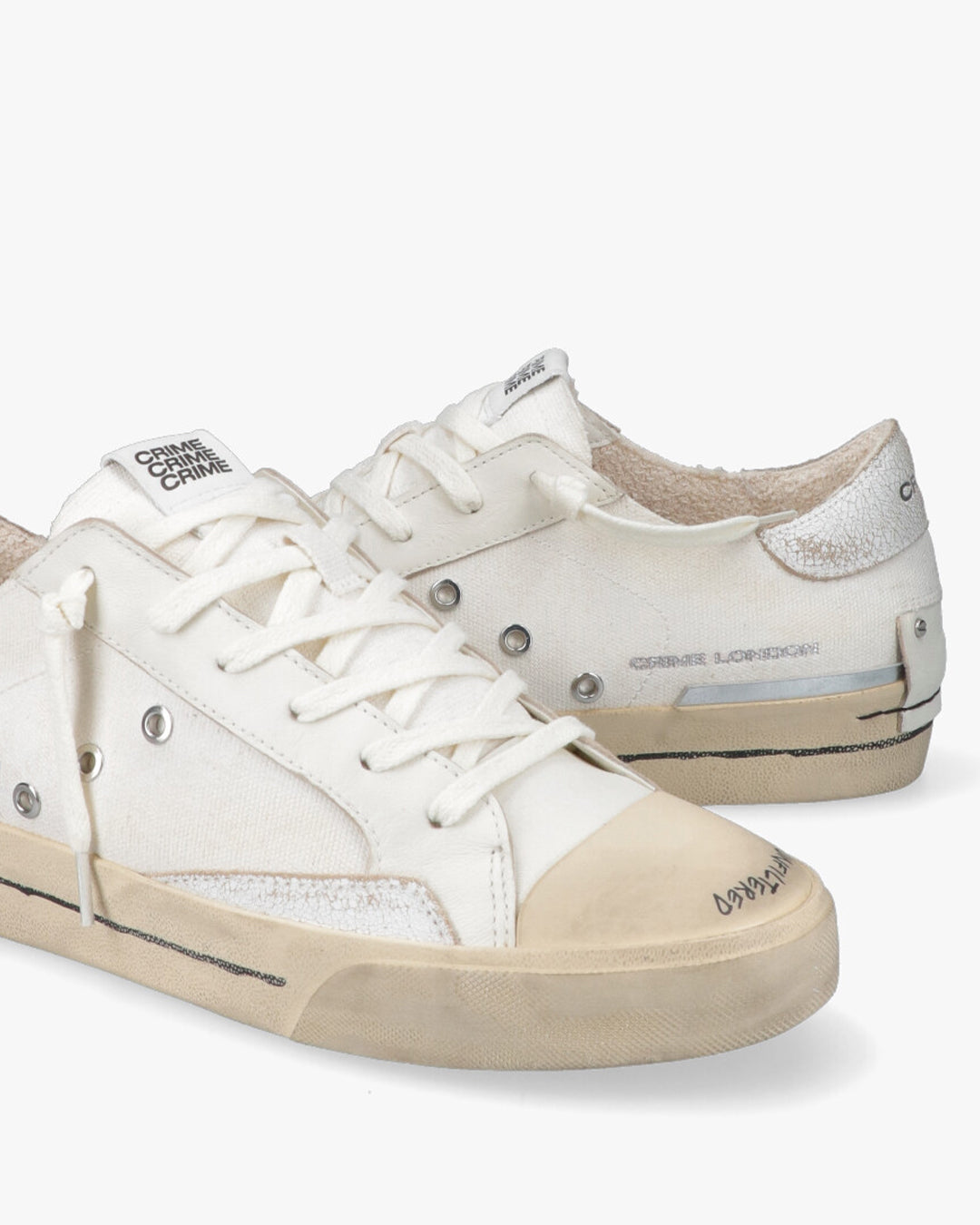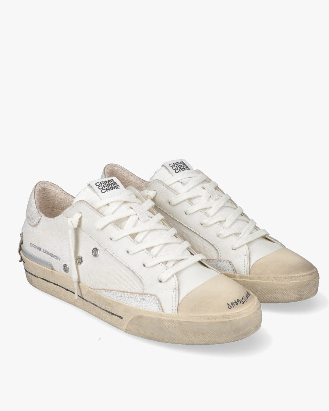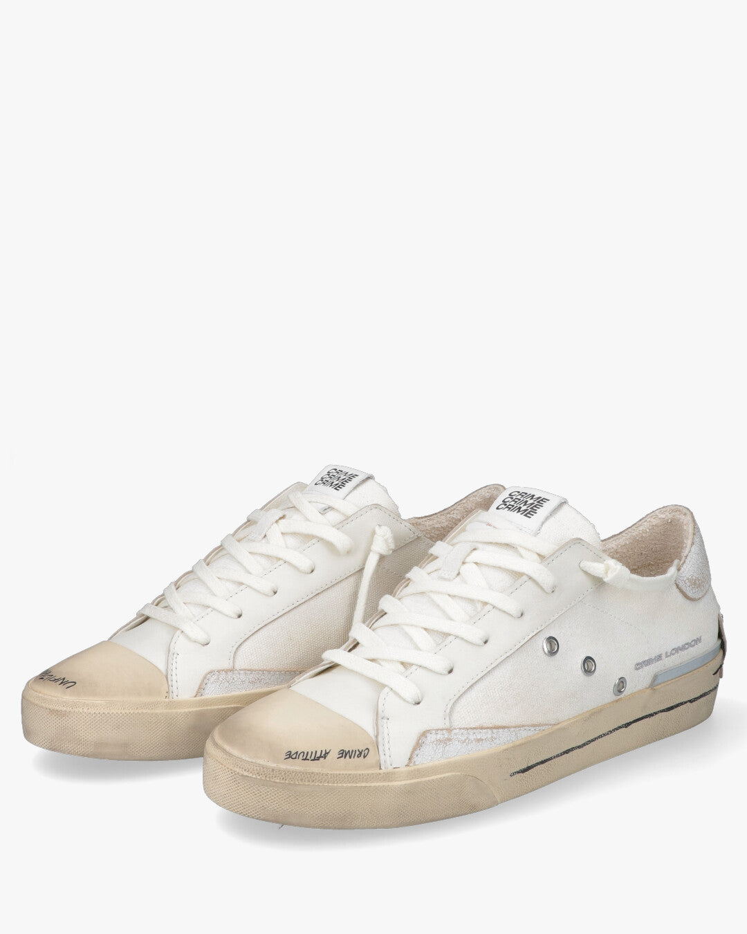Crime London - Unfiltered WhiteLe sneaker low-top Unfiltered di Crime London combinano materiali premium con un'estetica distressed d'ispirazione skate. Caratterizzata da una tomaia in canvas bianco dall'aspetto materico, questa scarpa si distingue per dettagli artigianali come le scritte hand-written Unfiltered e Crime Attitude sulle punte in gomma beige e la lavorazione effetto cracked sul tallone color argento. La suola dall'aspetto vissuto e i dettagli tecnici sul retro completano questo modello dal forte carattere urban.Dettagli del prodottoTomaia: canvas bianco con dettagli distressedDettagli: Talloncino argento cracked e graffiti hand-written sulla puntaAllacciatura: Lacci piatti bianchiSuola: Gomma beige effetto invecchiato con scritta decorativa lateraleDesign: Low-top con fodera interna logata e borchia sul retroUn modello iconico che si abbina perfettamente a denim over o cargo pant per un look casual e autentico.
