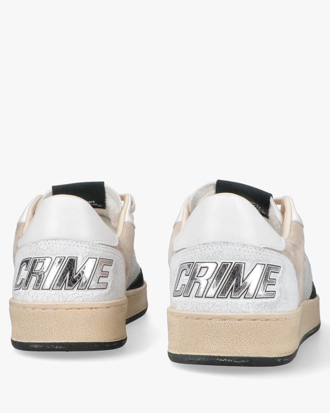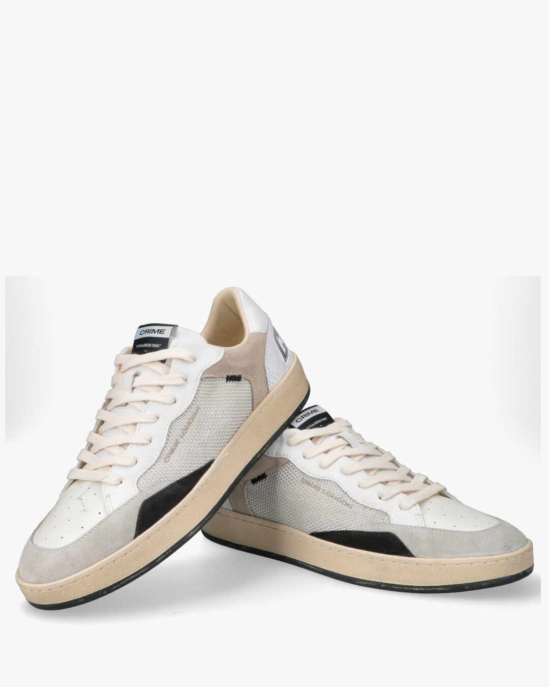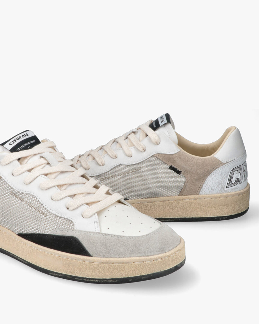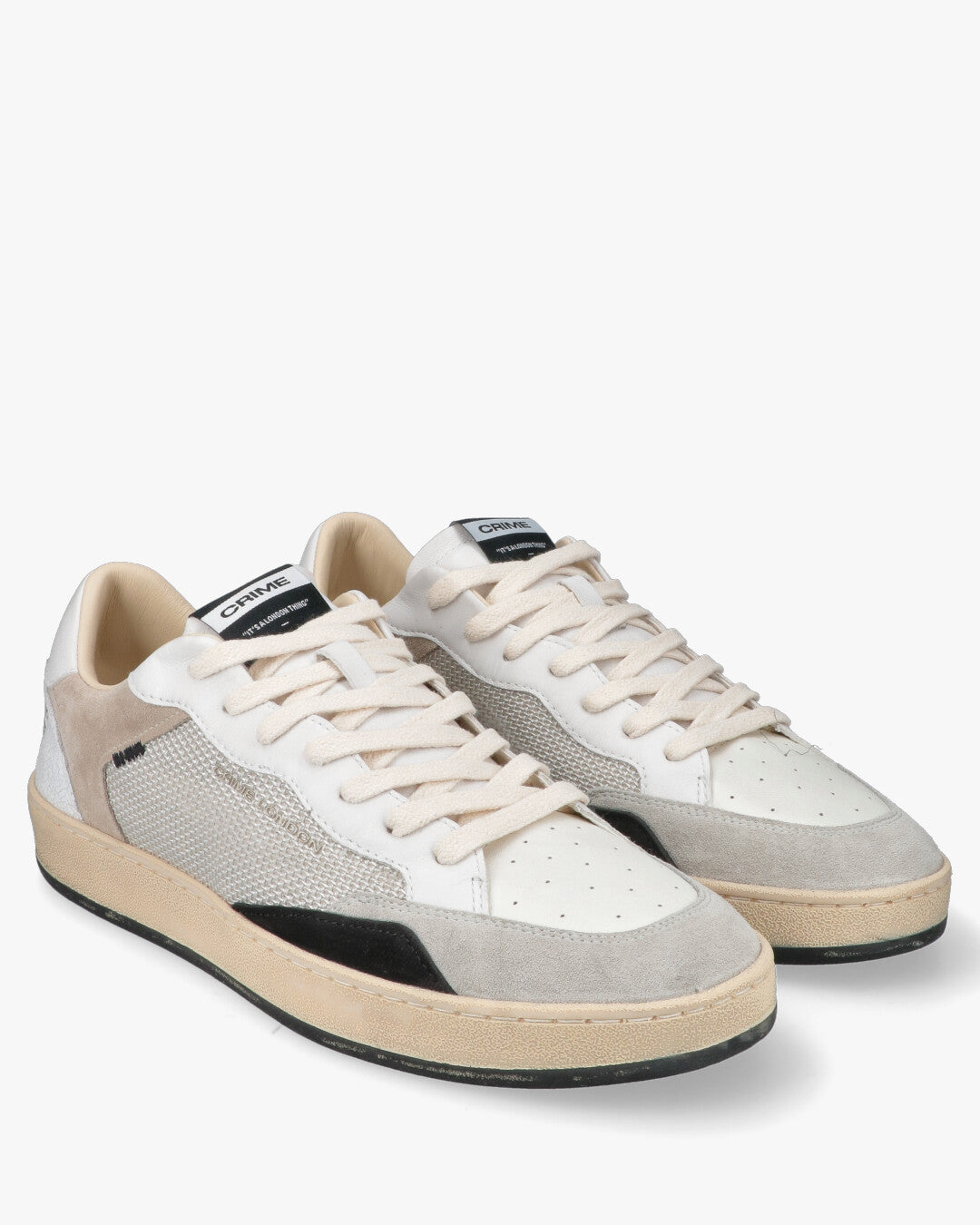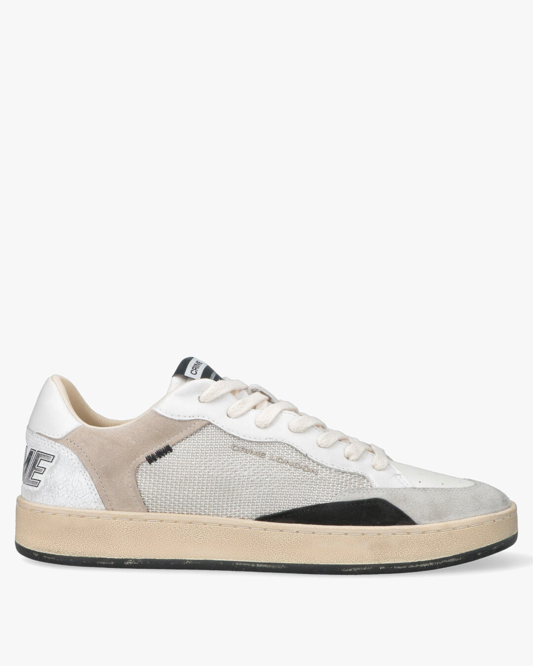 Crime London - Sneakers Distressed White & GreyL'equilibrio perfetto tra Vintage e ModernitàQueste sneakers firmate Crime London reinterpretano il classico stile sportivo con un tocco artigianale e contemporaneo. La tomaia multi-texture gioca su una raffinata palette di bianchi, grigi e beige, rendendole un accessorio versatile per ogni guardaroba urban.Dettagli Tecnici e di DesignMix di Materiali: Combinazione di pelle liscia, inserti in suede (scamosciato) e pannelli laterali in tessuto tecnico traspirante.Effetto Distressed: Suola in gomma pre-consumata color miele per un look autentico vissuto.Finiture Premium: Dettaglio posteriore in pelle craquelé con logo CRIME in rilievo metallizzato silver.Dettagli Iconici: Punta traforata per una migliore ventilazione e patch logata sulla linguetta con claim del brand.Stile e FitIl design low-top e la struttura ammortizzata offrono comfort durante tutta la giornata. Si abbinano perfettamente a un look casual con jeans slim-fit o a un outfit più ricercato con pantaloni chino.