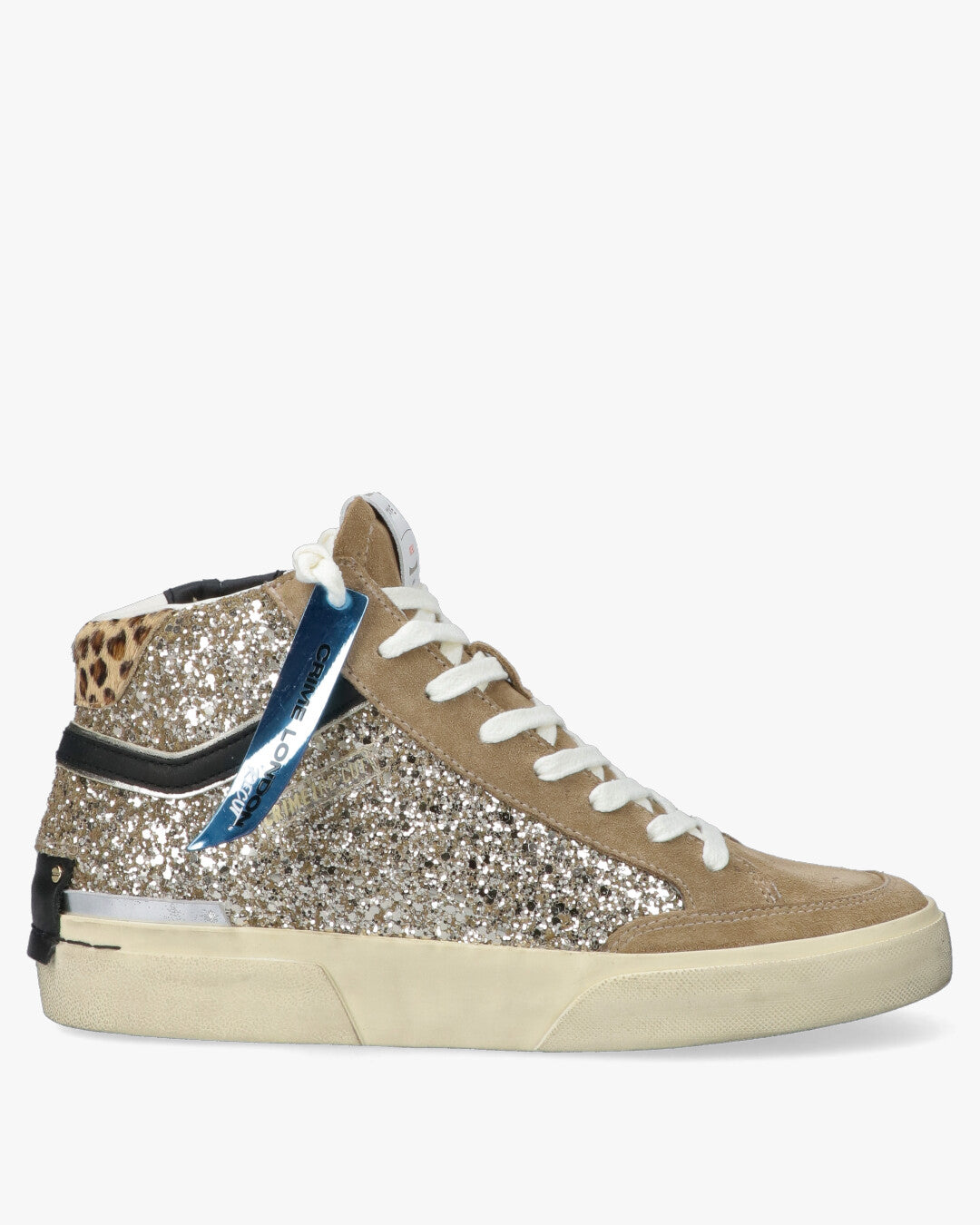 Leopard Print Glitter High-Top Sneaker (CL-25177AA8B)Design: Statement high-top sneaker that mixes textures and modern finishes.Color: Platinum/Beige base with light gold/silver glitter main panels.Materials: Beige suede (nubuck) mix and glitter-covered fabric side panels.Style Details: Leopard print back collar insert and black leather side stripe.Closure: Classic white laces and practical gold side zip for easy on and off.Sole: Vintage-effect (yellowed) rubber platform sole for a lived-in, modern look.Style: Perfect for adding a bold, glamorous touch to jeans, skirts, or casual trousers.