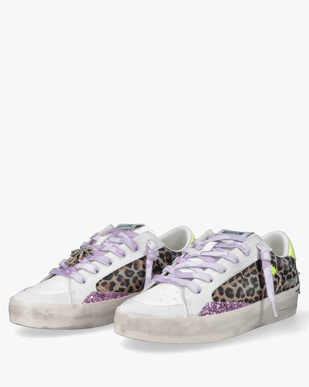 SK8 Deluxe Multicolor LeopardL'audacia dell'animalier incontra vibrazioni neon e accenti glam. Questa versione della SK8 Deluxe di Crime London è un vero manifesto di stile per chi non vuole passare inosservato. Il classico design skate viene stravolto da un mix eclettico di texture, stampe e colori accesi, mantenendo l'iconica estetica distressed che caratterizza il brand.Dettagli Prodotto:Mix Esplosivo di Materiali: Tomaia in pelle bianca con pannelli laterali in tessuto a stampa leopardata e dettagli in glitter lilla sulla base.Accenti Neon & Metallic: Tallone in pelle effetto cracklé giallo neon e spoiler posteriore argento metallizzato con cuciture a contrasto.Lacci & Charm: Lacci piatti in cotone sfumato lilla e bianco, arricchiti da un charm a forma di palma con strass rimovibile per un tocco luxury.Finitura Hand-Crafted: Suola in gomma platform con esclusivo effetto vintage consumato realizzato a mano.Dettagli Signature: Etichetta sulla linguetta in argento e patch laterale gommata SK8 Deluxe.Composizione e Cura:Tomaia: Pelle, Tessuto e Materiali sinteticiInterno: Mix di Pelle e Spugna di cotone per la massima traspirabilitàSuola: Gomma antiscivolo con profilo a cassettaPunta: Tonda traforata per una migliore ventilazioneConsiglio dell'editor: Abbinale a un pantalone cargo nero o a una gonna minimalista per far risaltare il contrasto tra la stampa leopardata e i dettagli neon. Sono la scelta ideale per dare carattere anche all'outfit più semplice.
