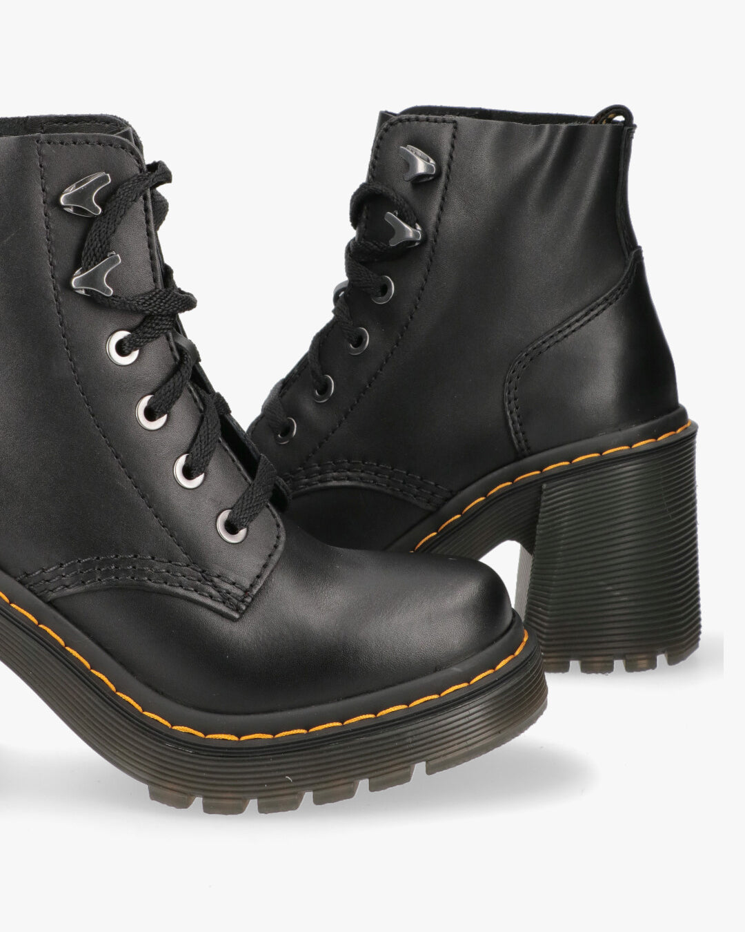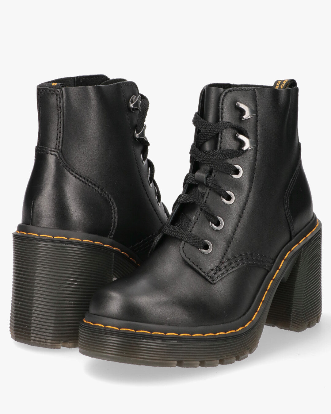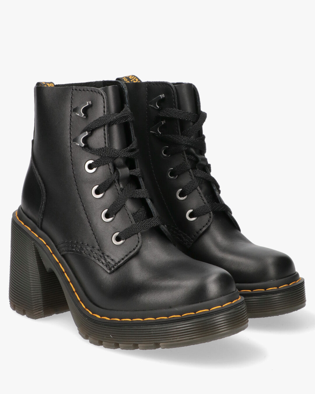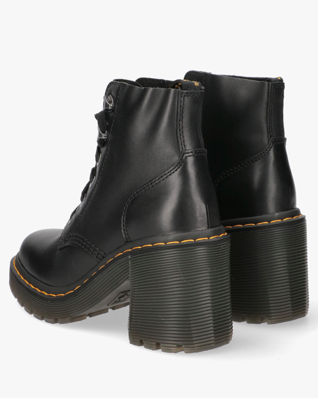 Dr. Martens 4-eye boot in black leather. Classic black rubber sole with yellow stitching, 6 cm heel.