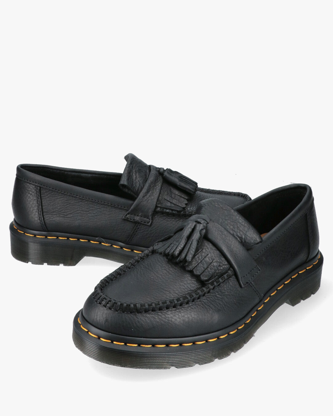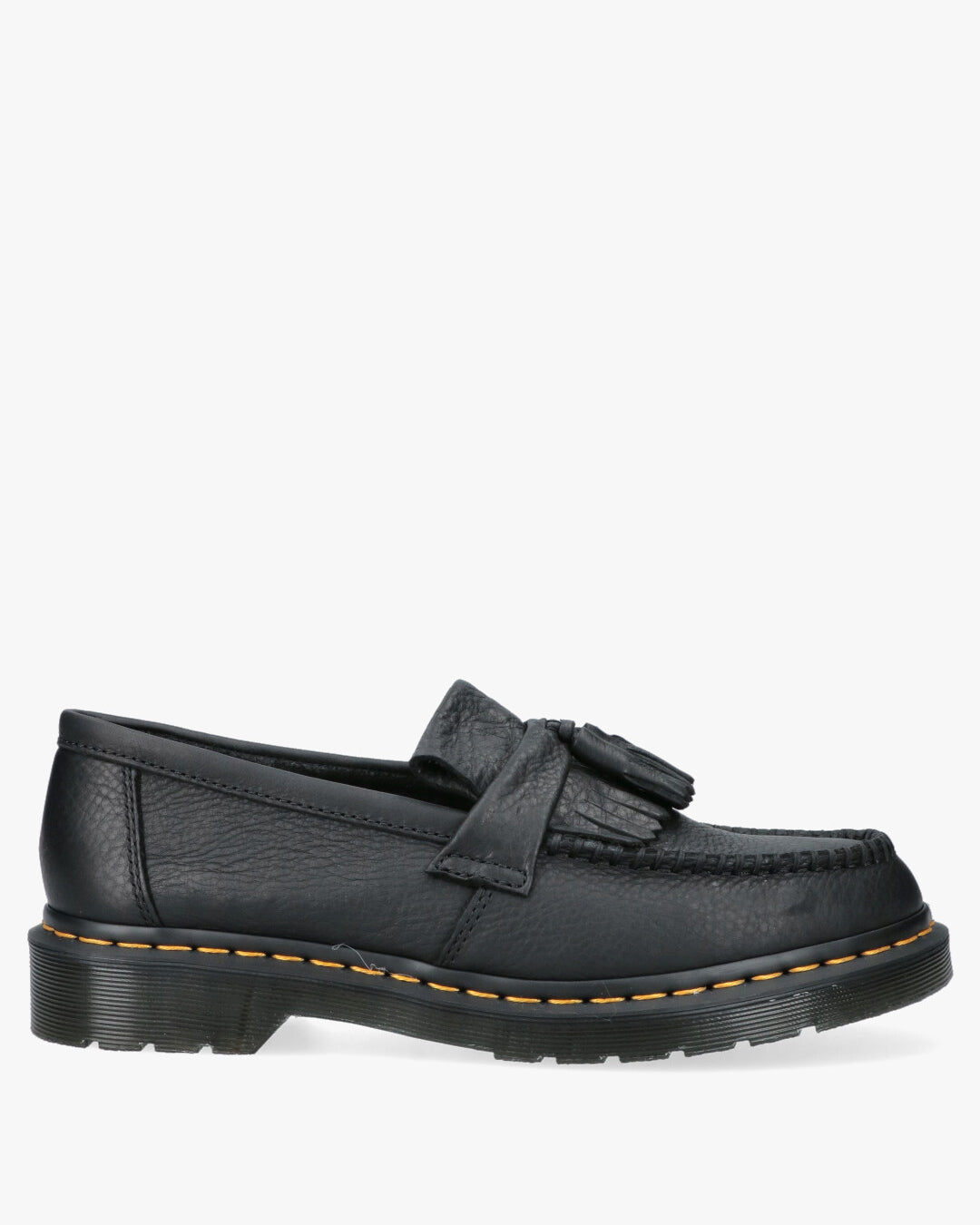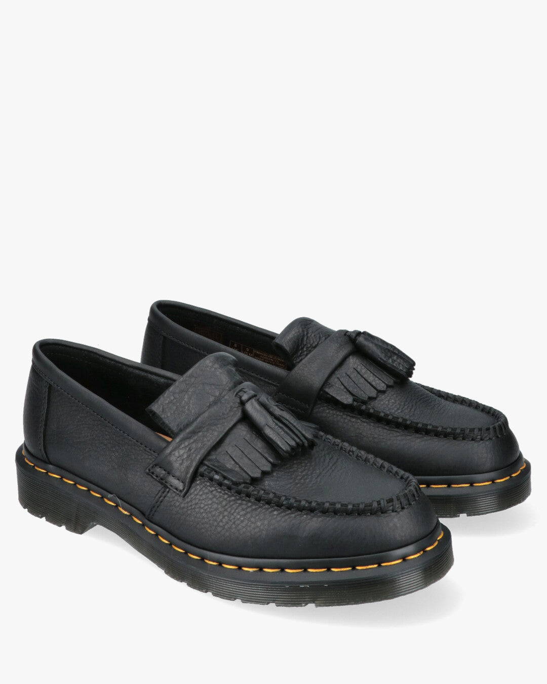 Product Description: Dr. Martens Adrian Tassle in Tumbled Leather (or similar)Inspired Style: Adrian Tassle loafer, a reinterpretation of the classic loafer with a rugged Dr. Martens aesthetic.Distinctive Material: Black Tumbled/Pebbled Leather upper, which provides a textured look and added softness.Preppy/Grunge Details: Fringe and tassels on the instep, enriched by traditional stitching that defines the toe.Iconic Construction: Cushioned AirWair sole and yellow welt stitching, symbolizing the unmistakable Dr. Martens durability (Goodyear Welt).Fit: Slip-on style ideal for those seeking a mix of a sophisticated look and a comfortable, durable base for everyday use.