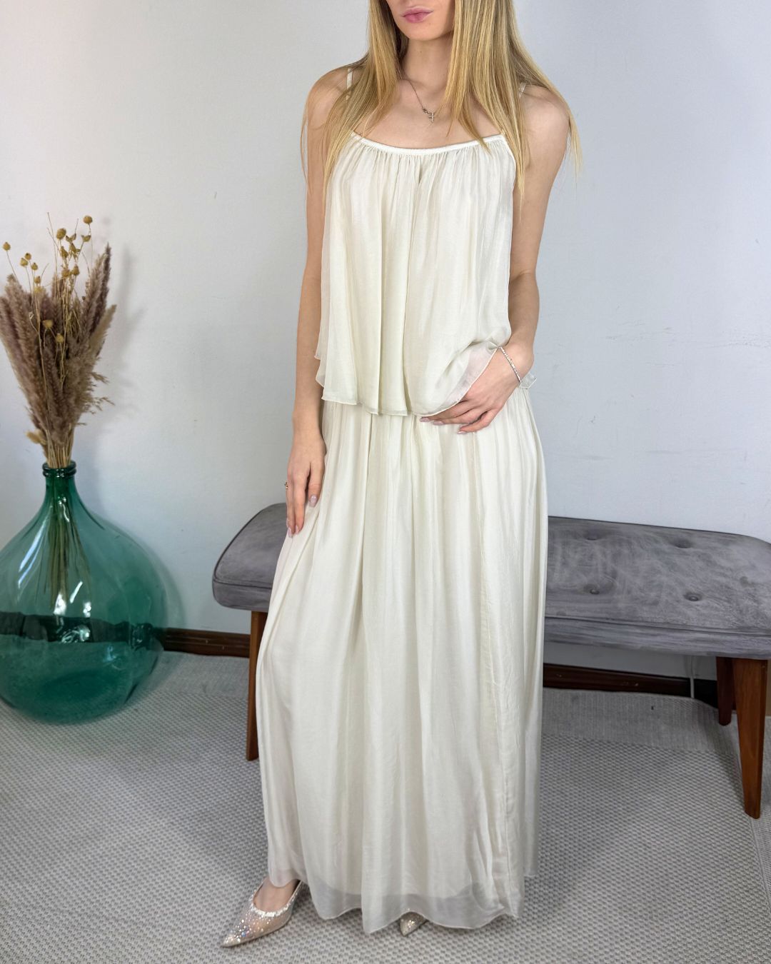 Flowing Top - Antique White. Timeless lightness and femininity. This spaghetti-strap top embodies ethereal elegance thanks to its flared design and satin-finish fabric. The cape-like silhouette creates fluid, natural movement, making it the ideal piece to complete a formal look or add a chic touch to a summer outfit. Product Details: Model: Top with adjustable spaghetti straps. Design: Gathered round neckline that creates a soft drape. Details: Asymmetrical double-layer cut for a light, voluminous effect. Color: Antique White (Ivory). Style: Elegant / Boho-chic. Composition and care: Fabric: Semi-sheer technical fabric with luminous reflections. Care: Hand wash or wash on a delicate cycle; avoid spinning to preserve the integrity of the fabric.
