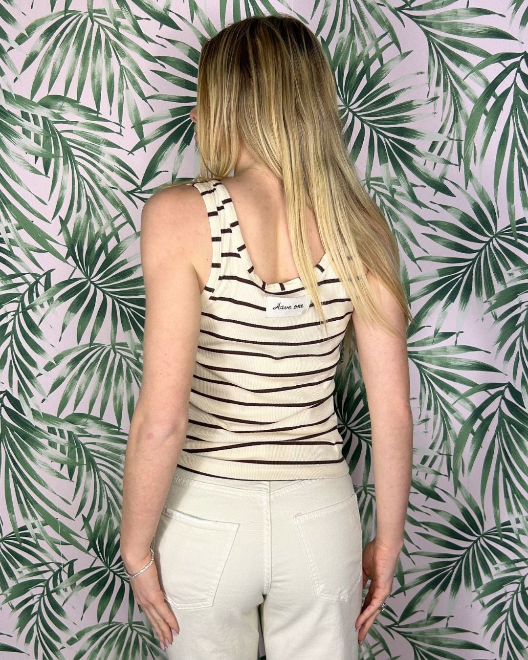 Striped Tank Top with Buttons. Design: Sleeveless top with a deep round neckline and three-button front closure. Fabric: Fine-ribbed stretch fabric for a defined silhouette. Details: Delicate trims on the neckline and Have One text logo applied to the external label on the back. Pattern: Classic brown horizontal stripe pattern on a cream base. Fit: Shaped cut that follows the lines of the body with extreme naturalness. The model is 1.72 m tall and wears size S.