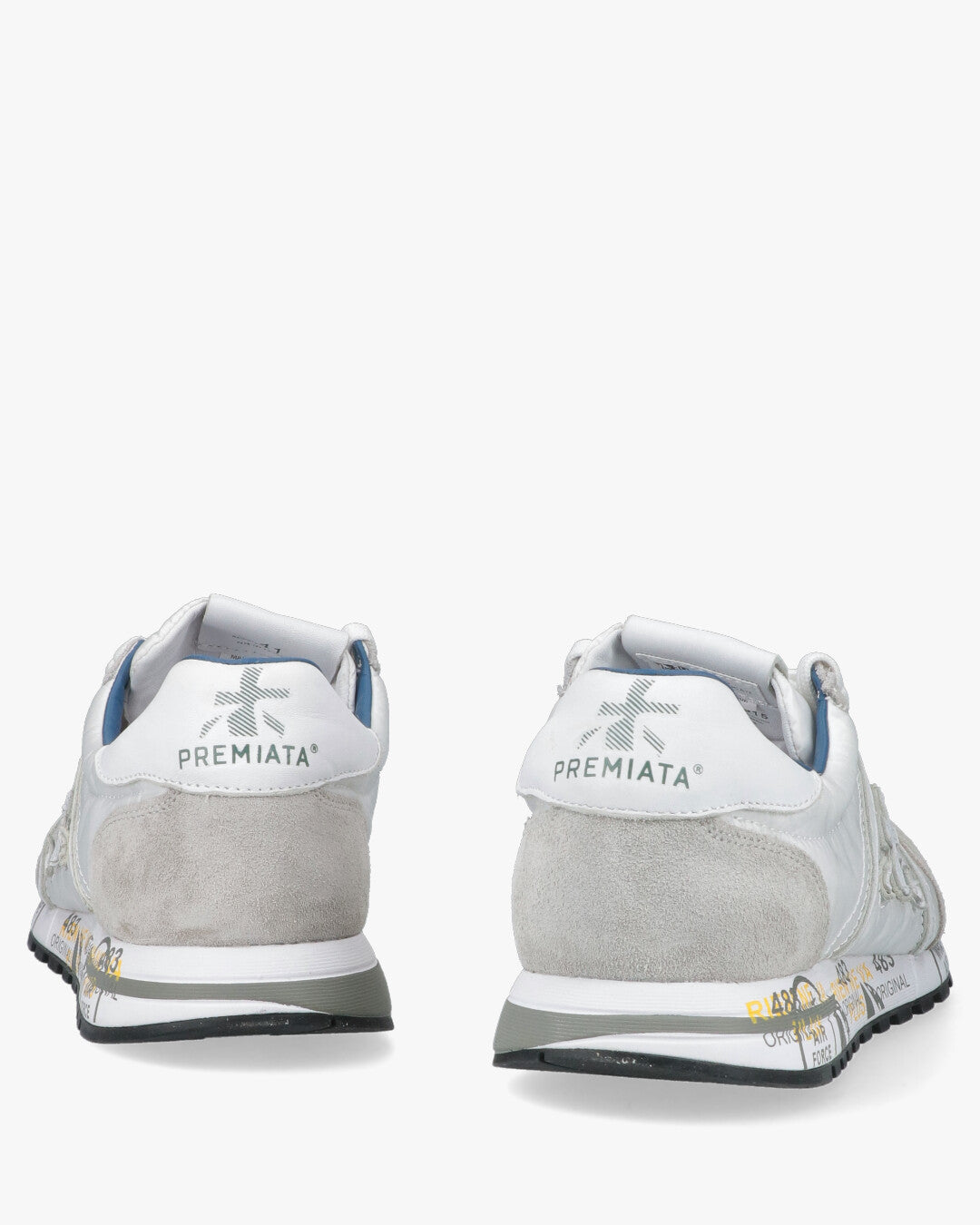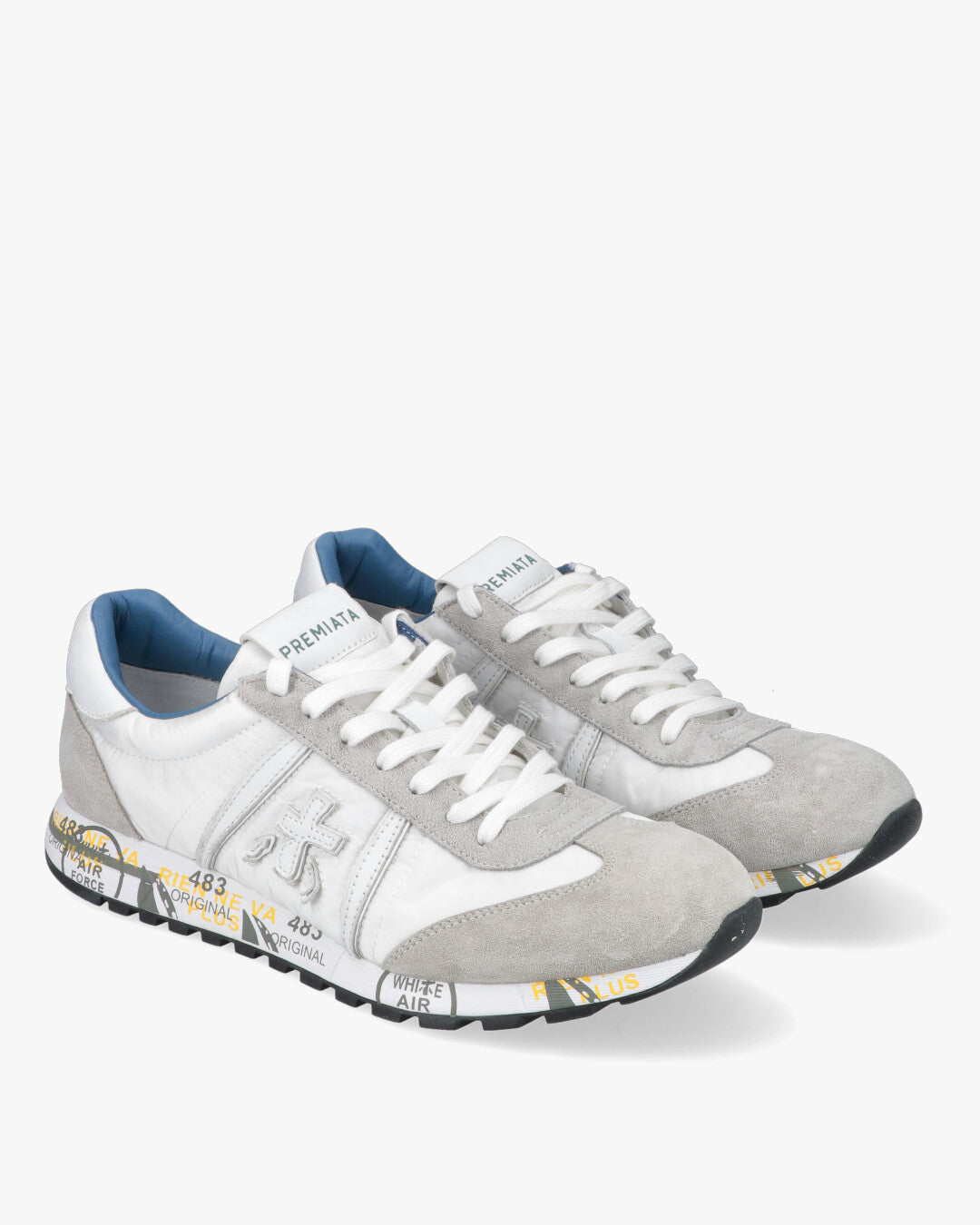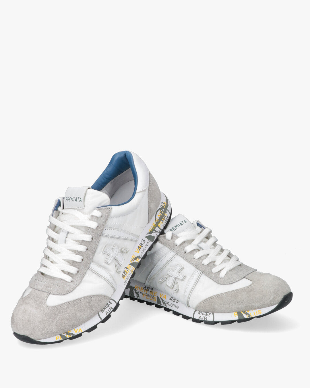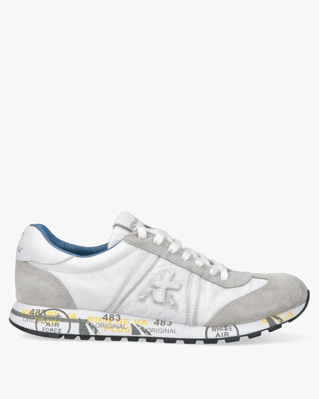 PREMIATA LUCY BIANCO E GRIGIOSneaker Iconica dal Design Urban RetroLa Premiata Lucy rappresenta l'essenza dello stile senza tempo del brand, combinando una silhouette d'ispirazione running vintage con materiali tecnici d'avanguardia. Questa variante cromatica sui toni del bianco e del grigio e la scelta ideale per chi cerca una calzatura versatile, leggera e ricca di carattere.Caratteristiche Principali:Mix di Materiali Premium: La tomaia e realizzata in tessuto tecnico bianco traspirante, arricchita da morbidi inserti in suede grigio chiaro sulla punta, sul tallone e lungo l'occhiellatura.Dettagli di Contrasto: Il design e vivacizzato da una fodera interna in pelle azzurro polvere, che dona un tocco cromatico inaspettato e raffinato. Il logo Premiata laterale e applicato in rilievo con cuciture a vista.Suola Logata Distintiva: La suola in gomma ultra leggera presenta le iconiche stampe grafiche di Premiata con accenti gialli, offrendo ammortizzazione e uno stile immediatamente riconoscibile.Comfort Quotidiano: Il colletto imbottito e la morbida soletta interna garantiscono una calzata confortevole per tutto il giorno, rendendola perfetta per un uso quotidiano dinamico.Dettagli Prodotto:Punta: TondaTipo di tacco: Senza tacco (Flat)Chiusura: Lacci piatti in cotone biancoDettaglio: Spoiler posteriore in pelle bianca con logoCodice articolo: LUCY-6915-6915