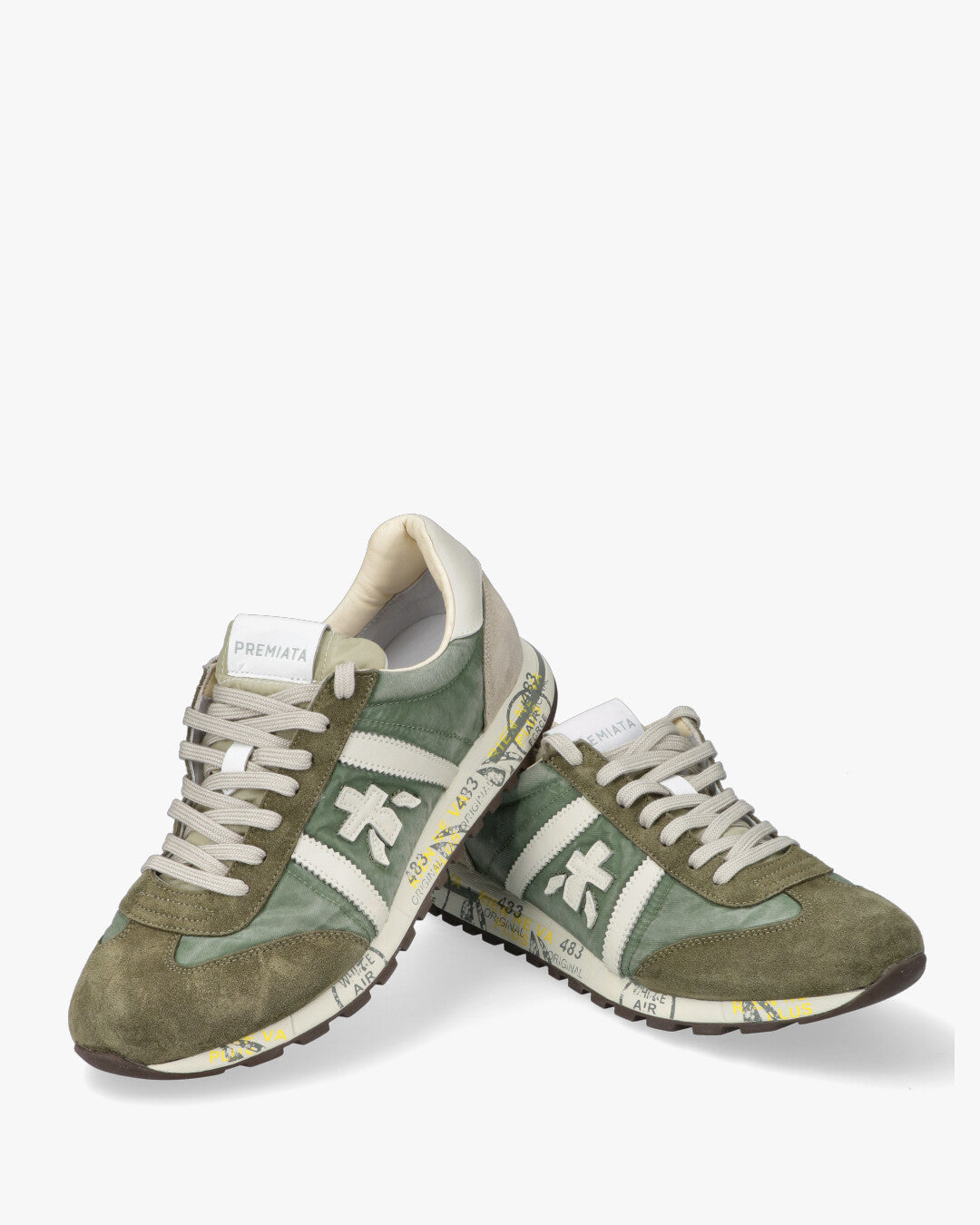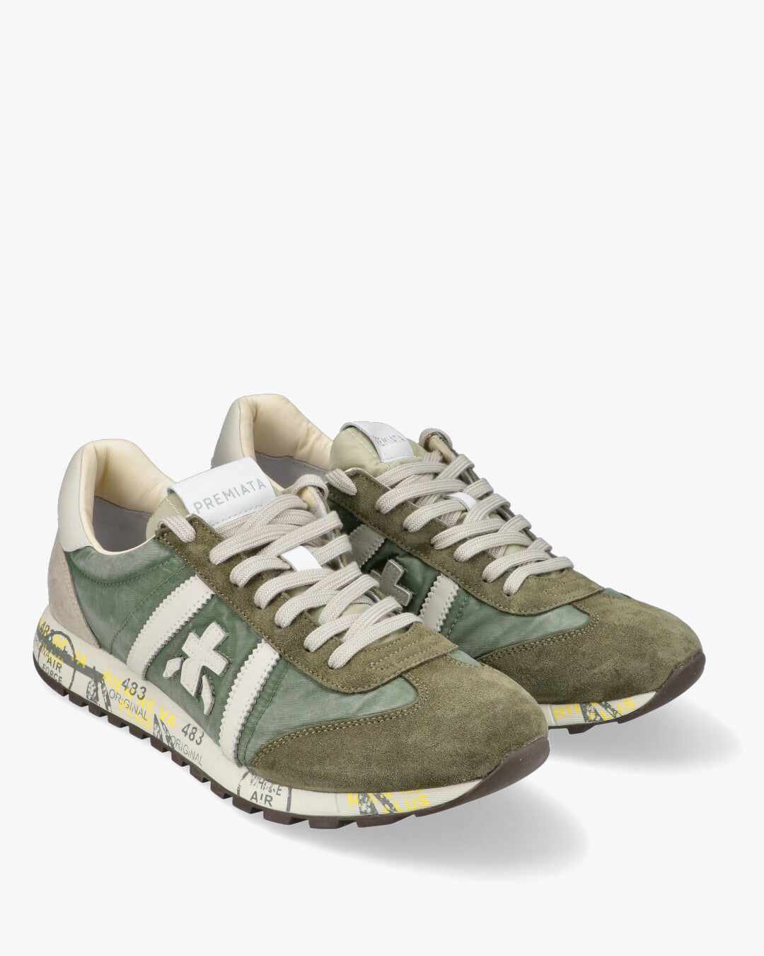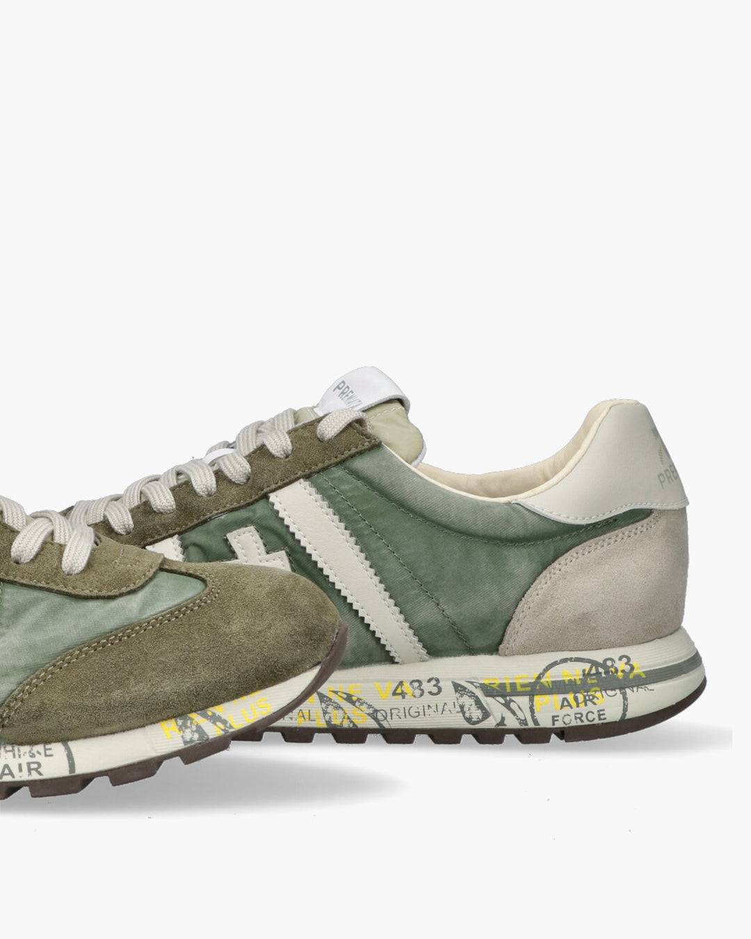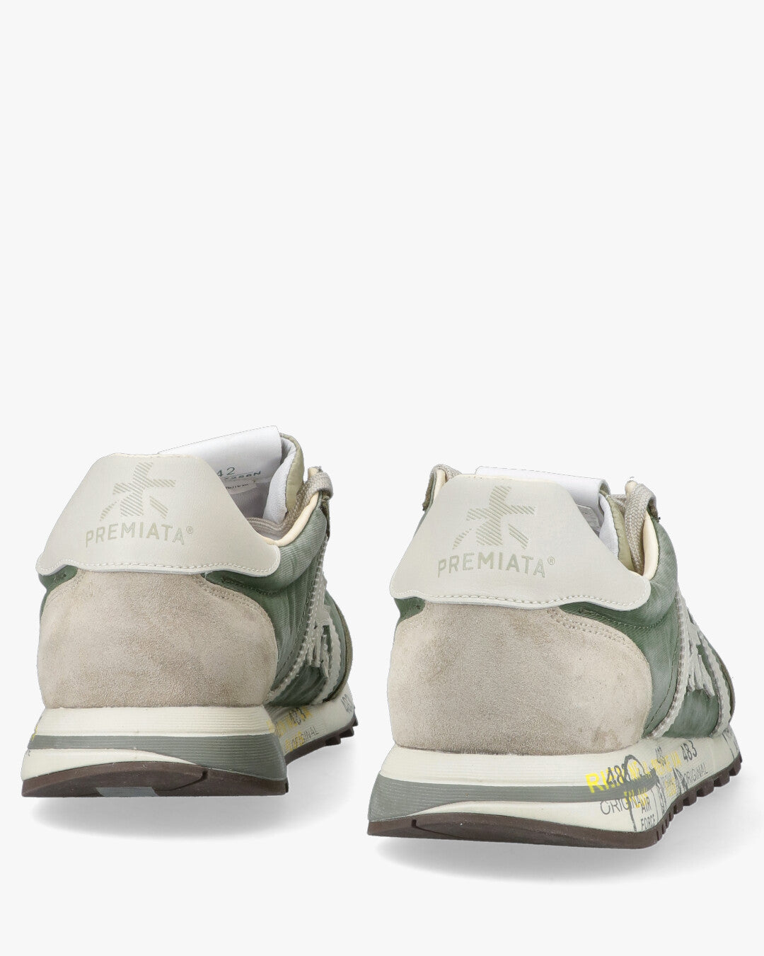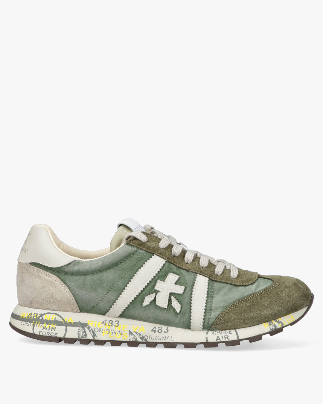 PREMIATA LUCY VERDE SALVIASneaker Casual dal Fascino Heritage e ContemporaneoLa Premiata Lucy si distingue per il suo spirito eclettico, capace di unire un'ispirazione sportiva retrò a dettagli estetici moderni. Questa versione in verde salvia offre una nuance sofisticata e naturale, perfetta per chi desidera una calzatura distintiva che si adatti con eleganza ai look quotidiani.Caratteristiche Principali:Texture Ricercate: La tomaia e realizzata in tessuto tecnico effetto stropicciato color verde salvia, completata da inserti in suede tono su tono sulla punta e sull'occhiellatura per un design materico e curato.Dettagli a Contrasto: Il tallone e il logo laterale sono rifiniti in pelle color panna (off-white), creando un contrasto pulito e armonioso che esalta le linee della scarpa.Suola Iconica: L'intersuola leggera e decorata con le inconfondibili stampe grafiche Premiata in nero e giallo, segno distintivo del brand, abbinata a un battistrada in gomma marrone scuro per un grip ottimale.Calzata Leggera: Progettata per il massimo comfort, presenta un interno foderato e materiali flessibili che la rendono ideale per le lunghe passeggiate in citta.Dettagli Prodotto:Punta: TondaTipo di tacco: Senza tacco (Flat)Chiusura: Lacci piatti color pannaDettaglio: Logo posteriore stampato sullo spoilerCodice articolo: LUCY-7256N-7256N