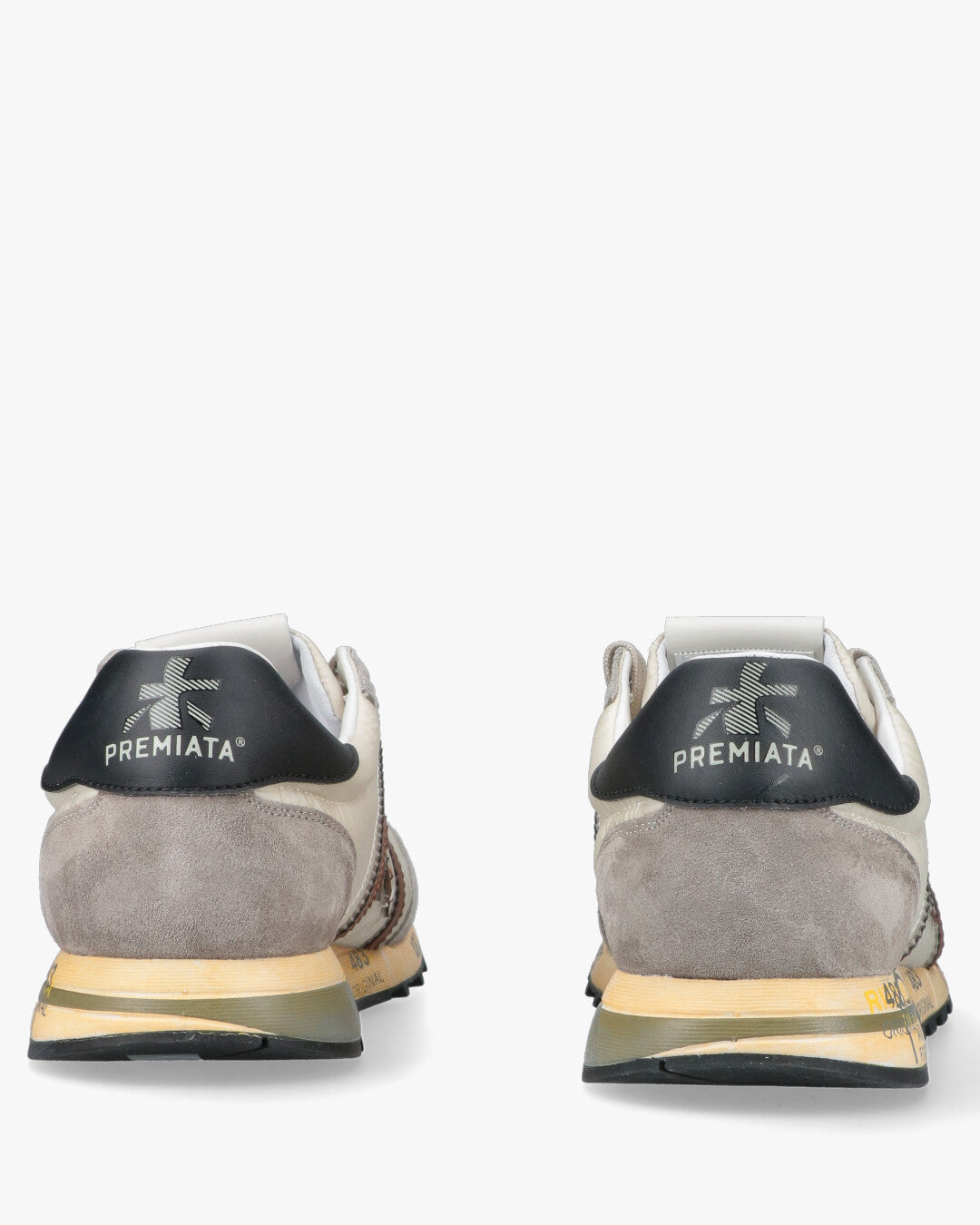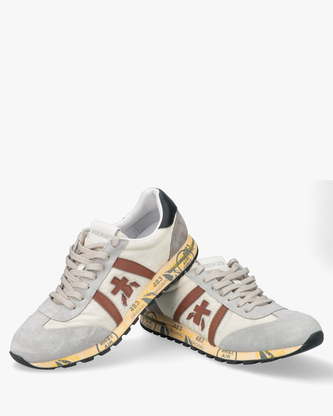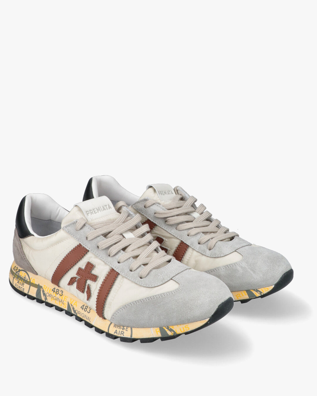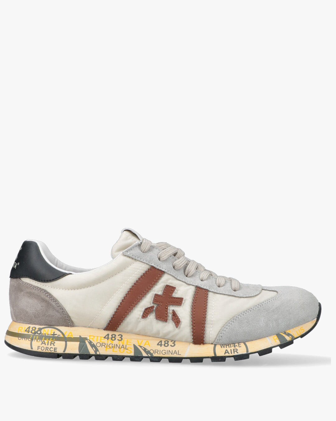 PREMIATA LUCY 8189Sneaker da uomo Premiata modello Lucy, una calzatura versatile che unisce sapientemente materiali di alta qualita e un estetica urban-chic. La tomaia e realizzata in tessuto tecnico color crema, arricchita da inserti in pelle scamosciata grigio chiaro sulla punta e sul tallone.Il design e definito dal logo laterale e dai profili in pelle marrone cuoio che creano un elegante contrasto cromatico, mentre il talloncino posteriore in pelle nera aggiunge un tocco di carattere deciso. La suola ergonomica, segno distintivo del brand, e decorata con le iconiche stampe grafiche e garantisce un eccellente supporto e comfort durante la camminata.Tomaia: Tessuto tecnico e pelle scamosciataFodera: 100% PelleSuola: Gomma logataChiusura: StringataColore: Crema / Grigio / Marrone / Nero