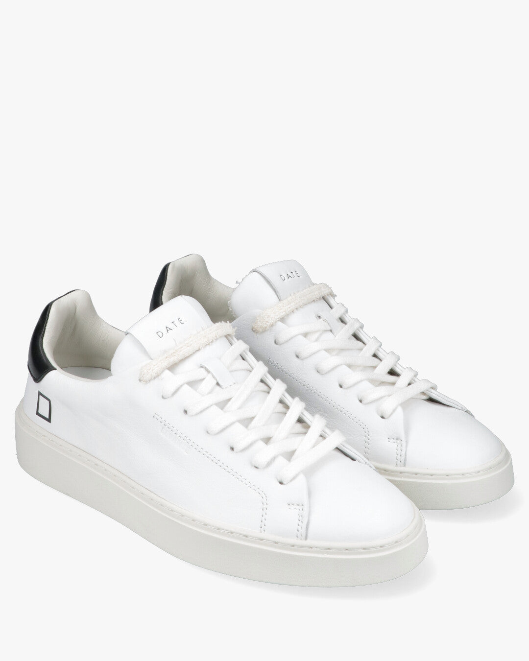 Design: Sneaker bassa dal profilo pulito ed essenziale, perfetta per un look urban chic.Tomaia: Realizzata in pelle liscia bianca di alta qualità per un'estetica minimale e raffinata.Dettagli a contrasto: Talloncino posteriore in pelle nera con cuciture tono su tono.Branding: Logo quadrato D.A.T.E. impresso lateralmente in nero nome del modello LEVANTE inciso sul profilo esterno.Chiusura: Lacci piatti in cotone bianco coordinati alla tomaia.Interno: Fodera in morbida spugna di cotone e pelle per garantire traspirabilità e comfort duraturo.Suola: In gomma opaca leggermente rialzata (circa 3 cm) con finitura monocromatica bianca.Qualità: Realizzata con materiali premium Made in Italy.Composizione e CuraMateriale esterno: 100% PelleRivestimento: Pelle e TessutoSuola: Gomma resistentePunta: TondaTaglia e FitVestibilità: Regolare (si consiglia l'acquisto della propria taglia abituale).Comfort extra: Soletta interna removibile e anatomica per un supporto ottimale del piede.