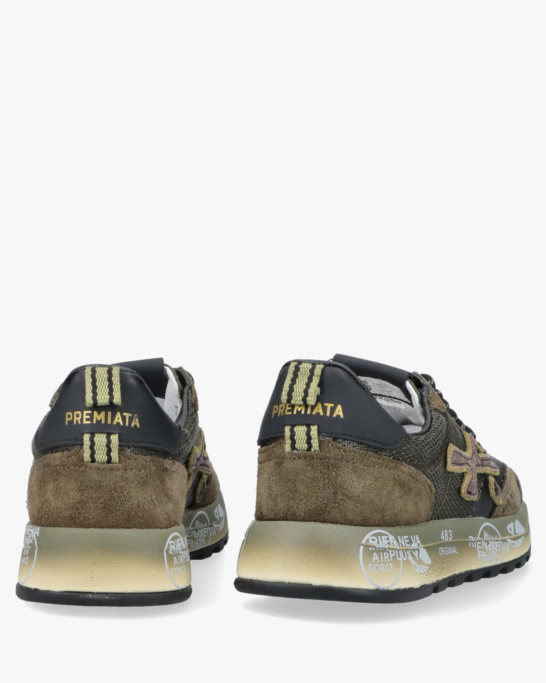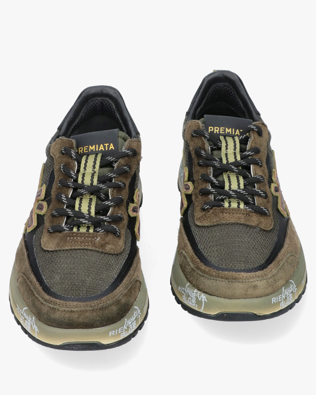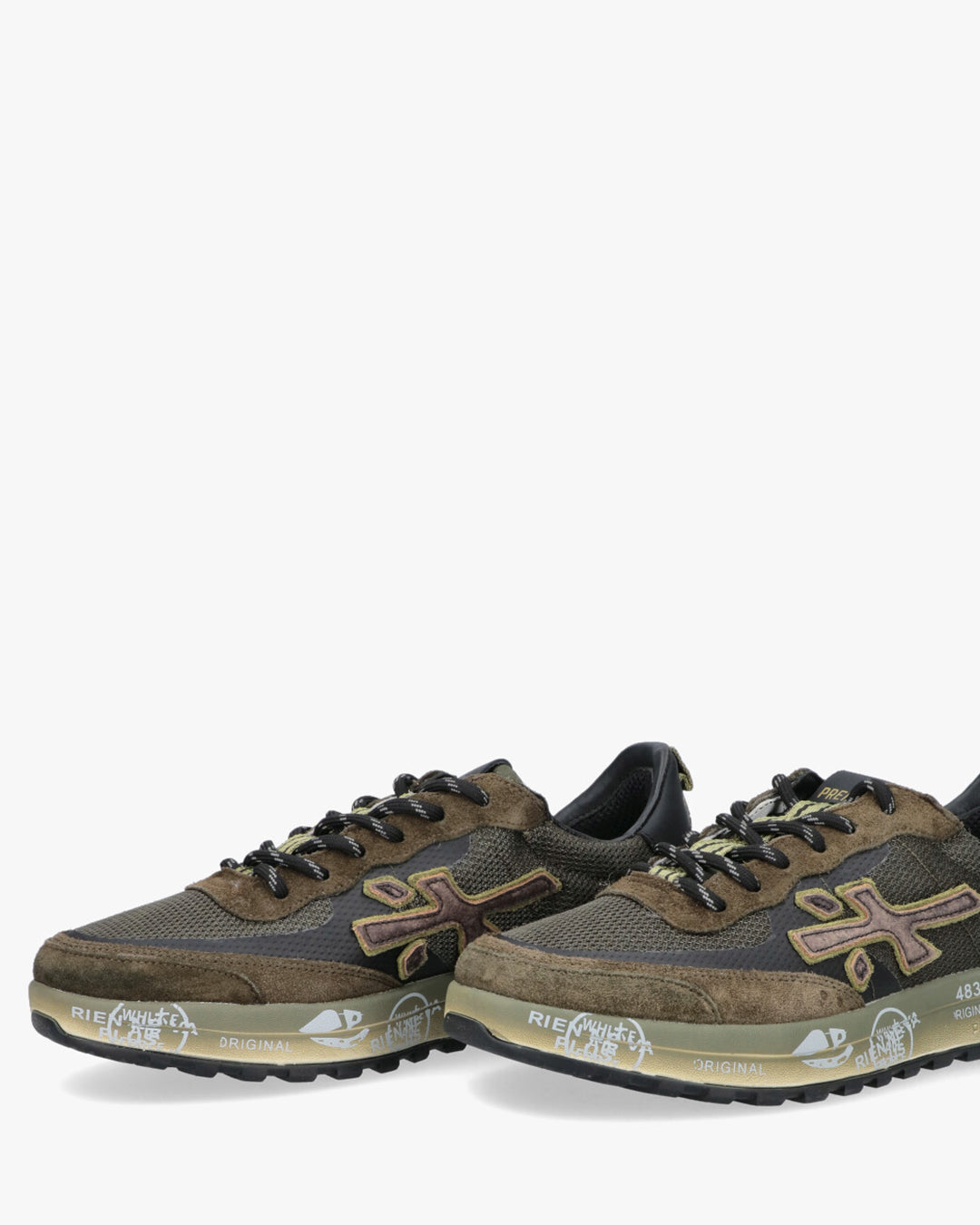 Model: NOUS 7731Brand: PremiataColor: Forest Green / Brown / BlackOuter material: leather, suede and technical meshLining: breathable fabricSole: rubber with White Air logo printClosure: black and dark grey lacesDetails: brown side logo with yellow profile, reinforced heel, handcrafted workmanshipStyle: casual sporty, urban contemporary