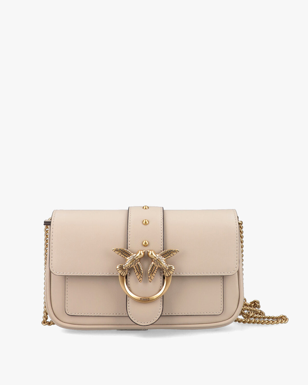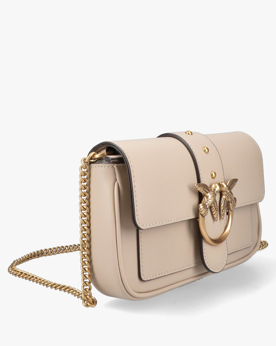 PINKO - Love Bag Bell Simply (Beige)Borsa a tracolla dal design strutturato e lineare, realizzata in morbida pelle liscia. Un modello classico e contemporaneo, impreziosito da borchie dorate sul baccello di chiusura per un tocco di carattere.Dettagli del ProdottoMateriale esterno: 100% Pelle di vacchetta liscia.Chiusura: Pattina con chiusura a incastro metallica, decorata con l'iconica fibbia Love Birds Diamond Cut e piccole borchie sferiche.Tracolla: Sottile catena metallica a maglia tonda in finitura oro antico.Colore: Beige/Cammello (C50Q).Extra: Tasca piatta a parete sul retro della borsa.Caratteristiche InterneFodera: Rivestimento interno in microfibra scamosciata.Organizzazione:Scomparto unico spazioso.Tasca interna a parete per piccoli oggetti.DimensioniLunghezza: 20 cmAltezza: 12 cmProfondità: 6 cm