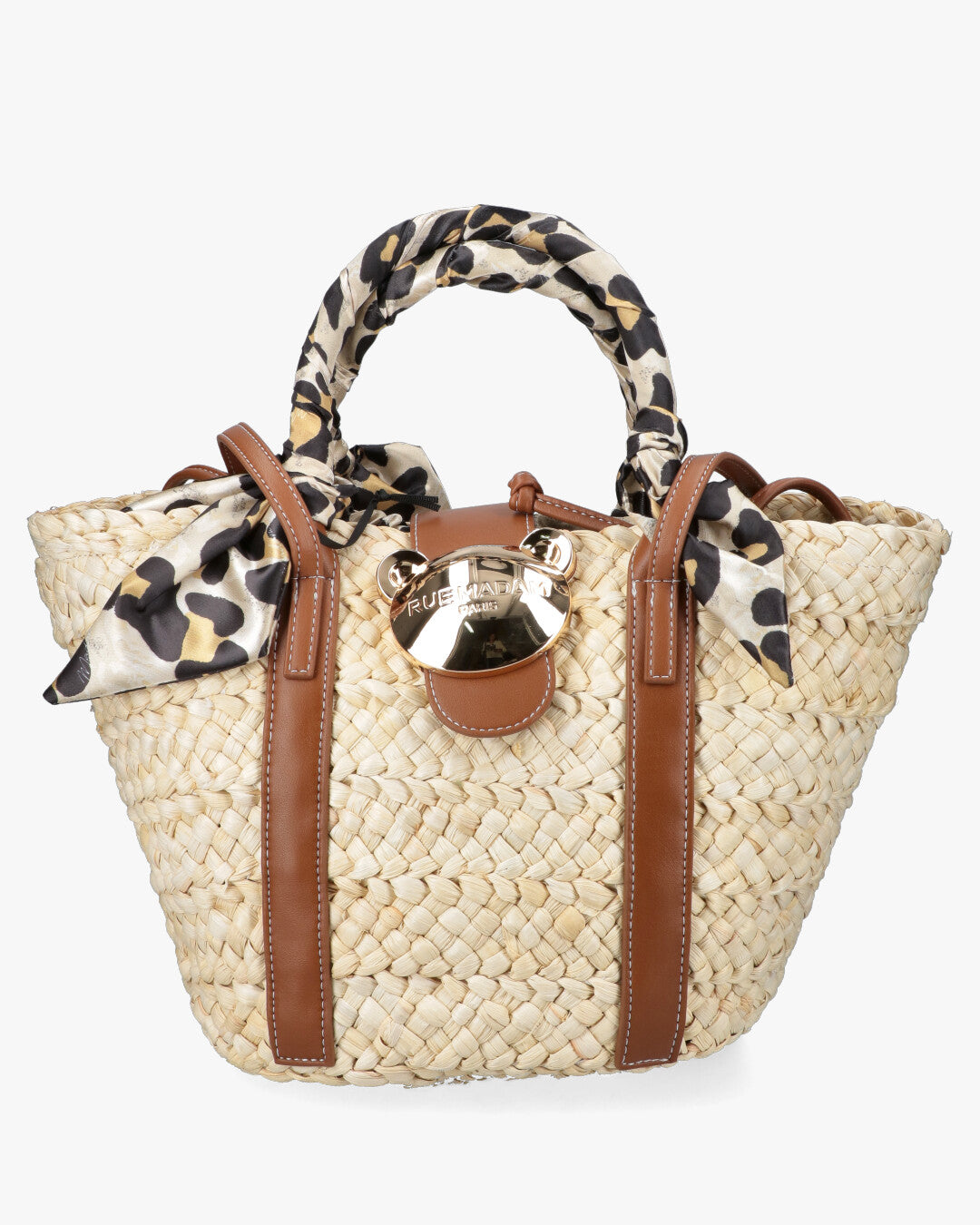 Rue Madam Paris - Soleil Basket LeopardL'iconica borsa a cesta si veste di un'eleganza audace e selvaggia con la Soleil Basket Leopard. Un accessorio artigianale che unisce la naturalezza della paglia intrecciata a dettagli glamour, perfetto per chi non vuole passare inosservata né in città né in riva al mare.Design: Cesta realizzata in paglia naturale intrecciata a mano, caratterizzata da una silhouette svasata e contemporanea.Dettagli Signature: Manici avvolti in un raffinato foulard in seta con stampa leopardata, che aggiunge un tocco sofisticato e protegge la mano.Finiture di Lusso: Profili in pelle color cuoio e l'iconica chiusura a scatto Teddy in metallo dorato lucido con logo Rue Madam Paris inciso.Interni: Foderata in tessuto con stampa animalier coordinata per un richiamo di stile anche all'interno dotata di tasca interna portaoggetti.Versatilità: Doppia portabilità grazie ai manici corti per il porto a mano e alla sottile tracolla in pelle per un uso a spalla più pratico.DimensioniLarghezza (superiore): 34 cmAltezza: 24 cm (esclusi i manici)Profondità: 14 cmUn pezzo unico dal carattere Wild-Chic, capace di trasformare anche il look più semplice in una dichiarazione di stile.