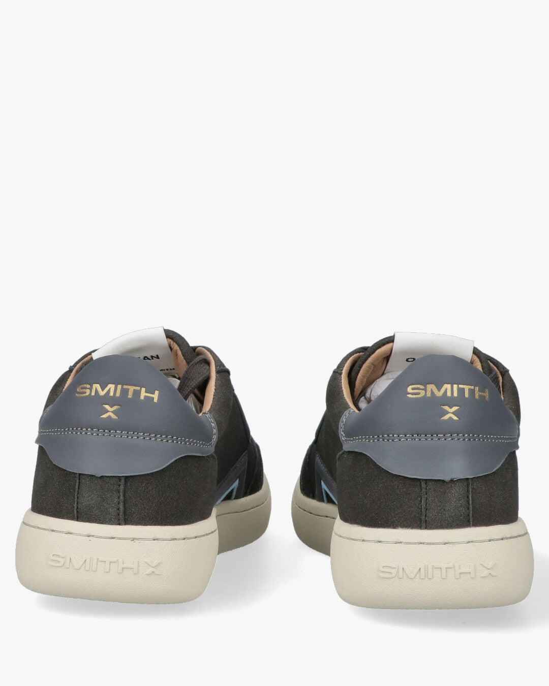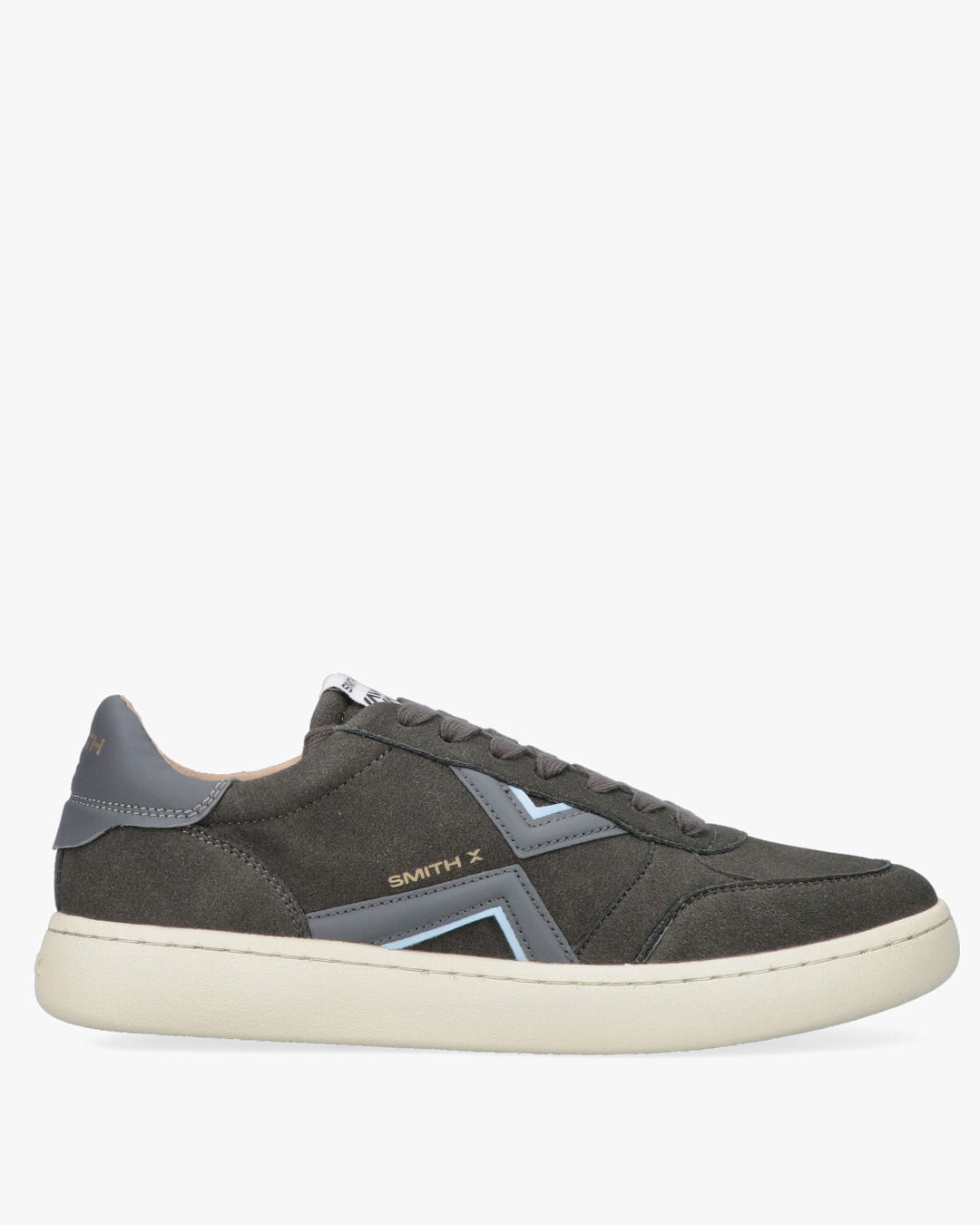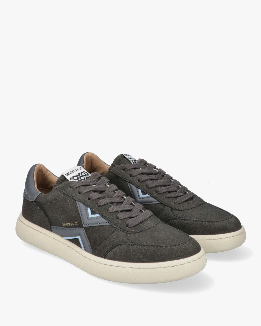 Smith X Low-Top Sneakers - SXBC0CM-9601 Dark GreyDesign: Low-top sneaker with a contemporary and versatile look, perfect for everyday wear.Color: Predominant Dark Grey shade, easy to match.Materials: Suede/suede fabric upper for a premium feel and contrasting light rubber sole.Details: Geometric side applications that form a distinctive logo or design, with medium grey accents and a thin light blue/light blue profile.Gold SMITH X logo printed on the side and heel.Padded tongue and heel with logo for optimal comfort.Tonal laces for a uniform look.Comfort: Sturdy construction with a slightly raised sole for good support and a modern look.Fit: Lace-up closure for an adjustable fit.