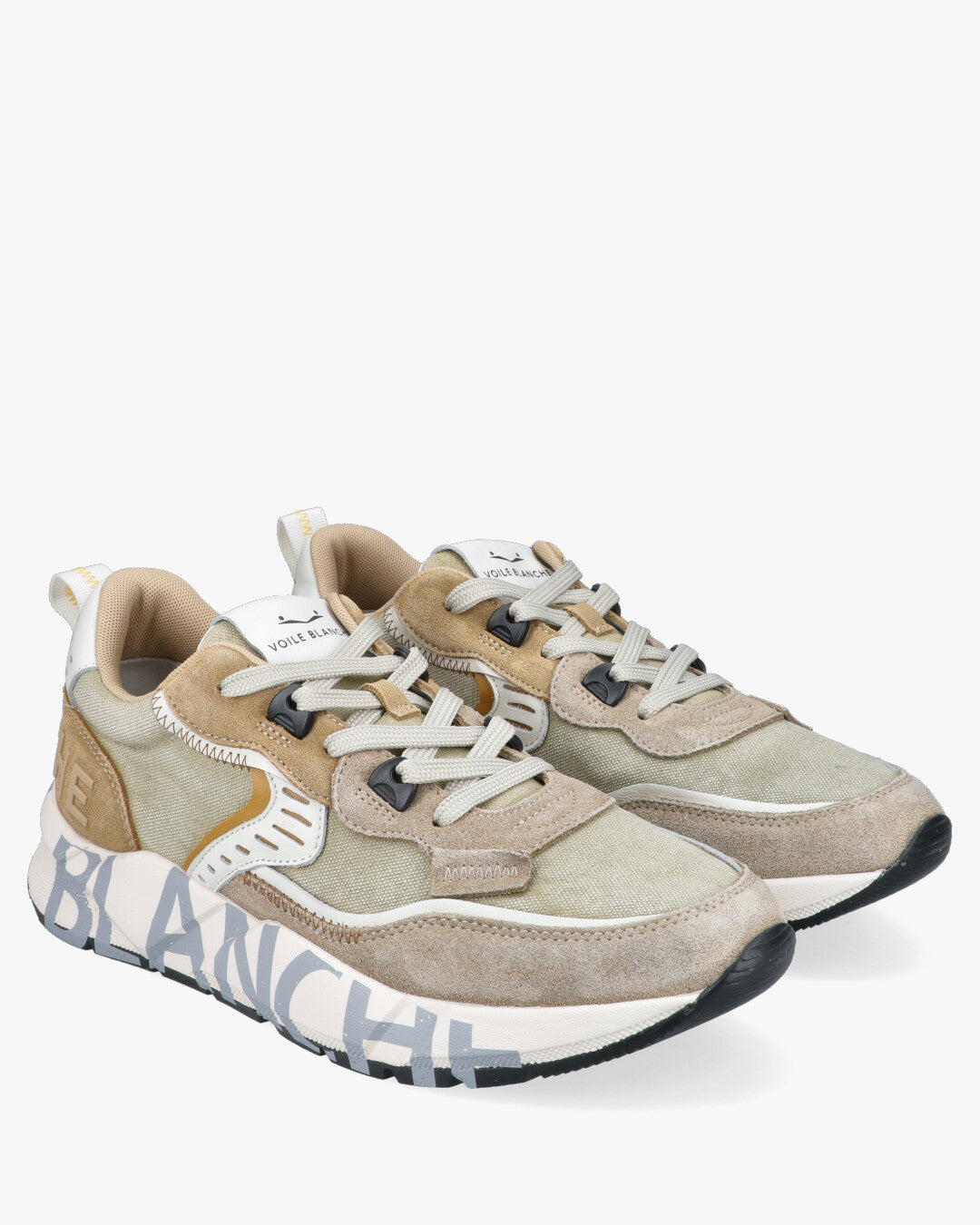 Voile Blanche - Monster Sneakers Sand/Caramel. A contemporary and bold sneaker featuring a sophisticated mix of materials and the iconic logo sole. Ideal for those seeking an urban-chic style that won't go unnoticed. Product Details: Multi-color design: Dynamic upper with inserts in sand, caramel, and cream tones. Material mix: Premium combination of suede and breathable technical fabric for maximum comfort. Statement sole: Maxi lightweight rubber sole with contrasting VOILE BLANCHE graphic print. Technical details: Reinforced loops, handcrafted visible stitching, and rubber rear insert with embossed logo. Comfortable fit: Lined interior and padded tongue with logo patch. Material and care: Upper: Leather and fabric. Lining: Fabric/leather. Sole: Synthetic material/rubber. Toe: Round. Closure: Flat cotton laces.