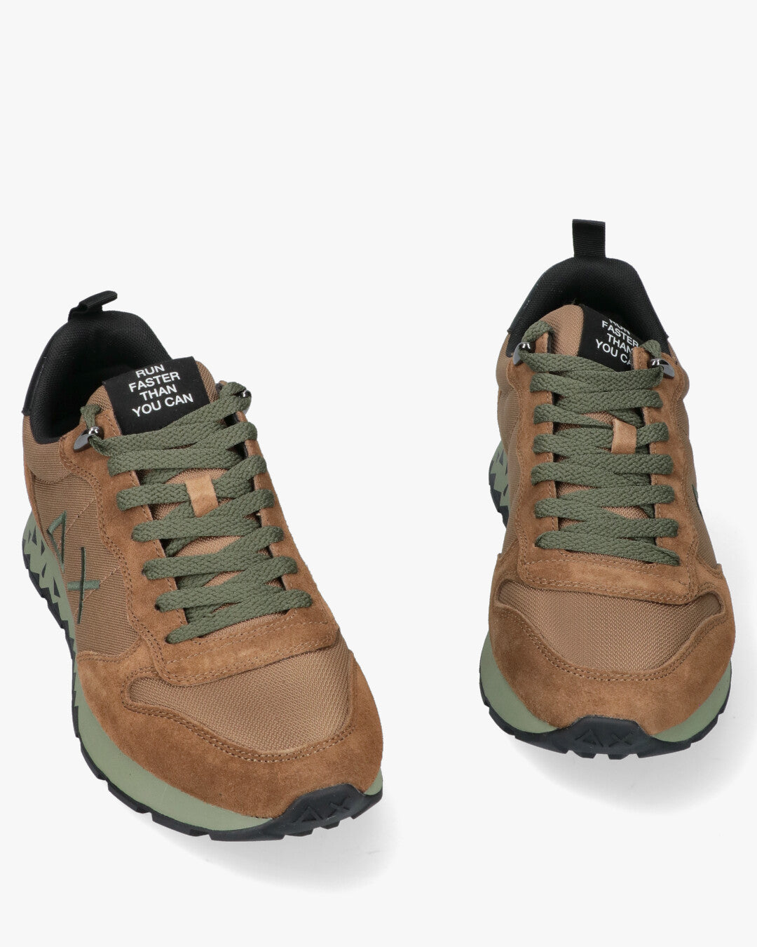 Color Mix: Combines a warm Fox (light brown/earth) shade with sage/olive details, perfect for the season. Durable Materials: Upper made from a mix of suede and technical fabric. Color Accents: Olive green laces and contrasting logo on the sides. Trail Sole: Thick and sturdy sage green sole with a contrasting black geometric pattern on the bottom, which offers excellent grip and character. Iconic Details: Black heel tab with 1968 print and tongue with RUN FASTER THAN YOU CAN writing. Style: Ideal for a casual outdoor look and for those who love earthy colors.