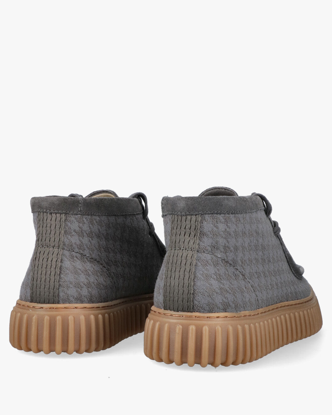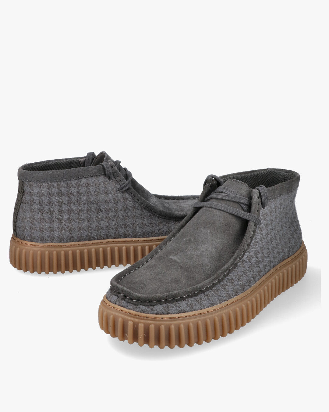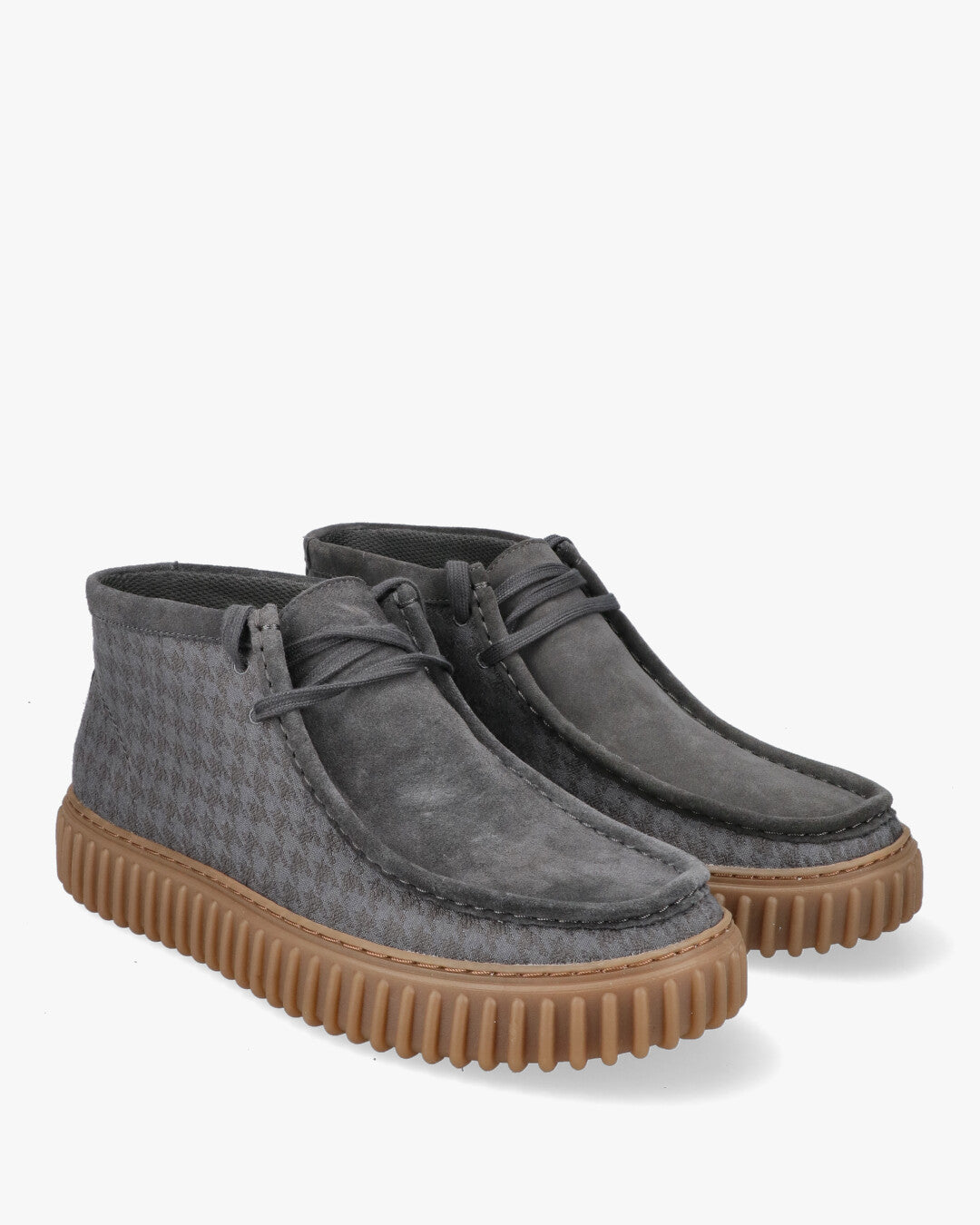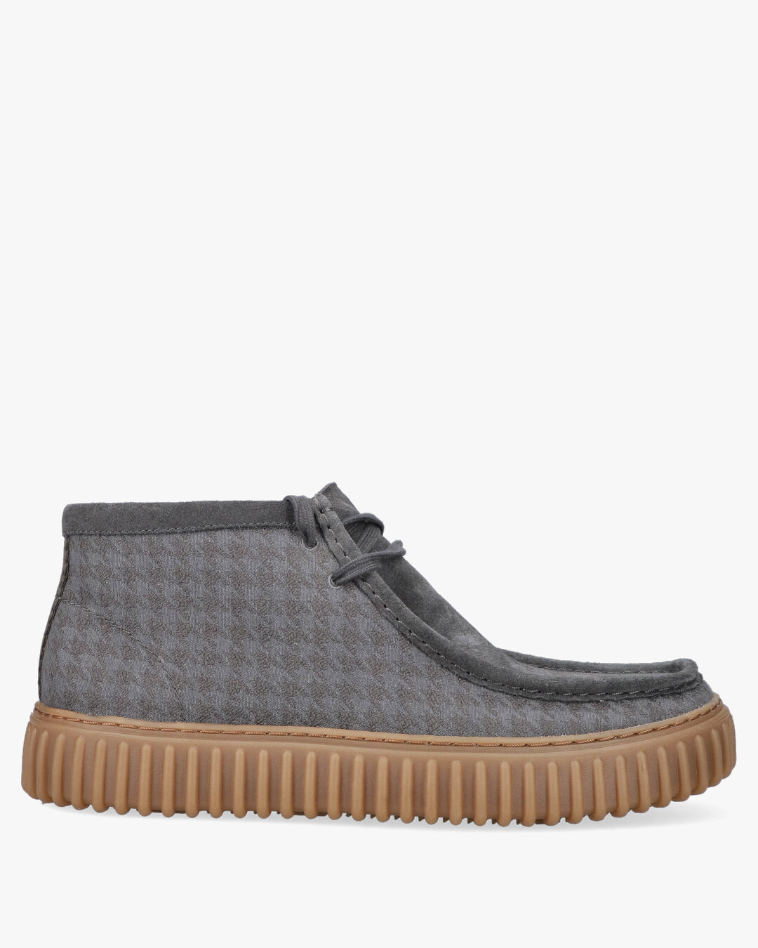 Clarks Originals Torhill Hi - Grey Pattern / Suola in Gomma NaturaleDesign Ibrido con Texture: Combina la silhouette classica del Wallabee Hi con un moderno motivo micro-fantasia pied de / monogram) sulla tomaia in pelle scamosciata grigia, creando un effetto visivo dinamico.Contrasto Materiali: La tomaia strutturata in pelle scamosciata grigia contrasta con la suola chunky (a carrarmato) in gomma naturale color miele/caramello.Dettaglio Heritage: Presenta la caratteristica punta mocassino cucita e il classico tag pendente Clarks Originals sui lacci tono su tono.Suola Platform: La suola scanalata è robusta e spessa, garantendo un'ottima trazione e un look street-style di tendenza.Comfort: Include il plantare Contour Cushion sagomato per un supporto ottimale.Versatilità Smart-Casual: Perfetta per elevare un outfit casual con un tocco di eleganza discreta, adatta sia al denim che a pantaloni sartoriali.Vestibilità: Stivaletto stringato alla caviglia.