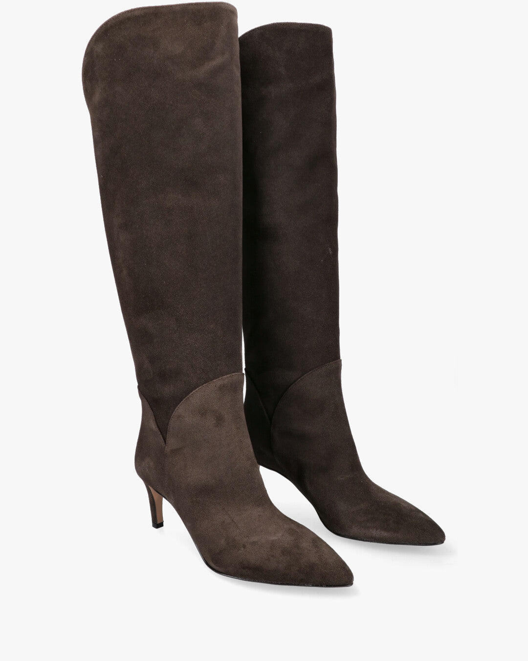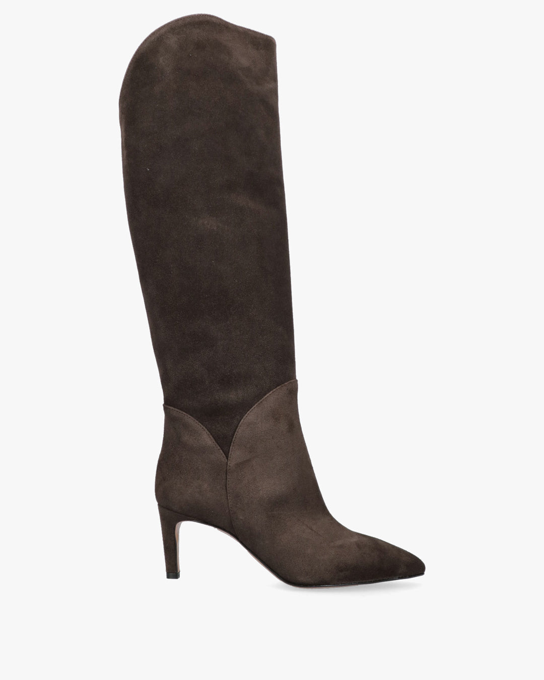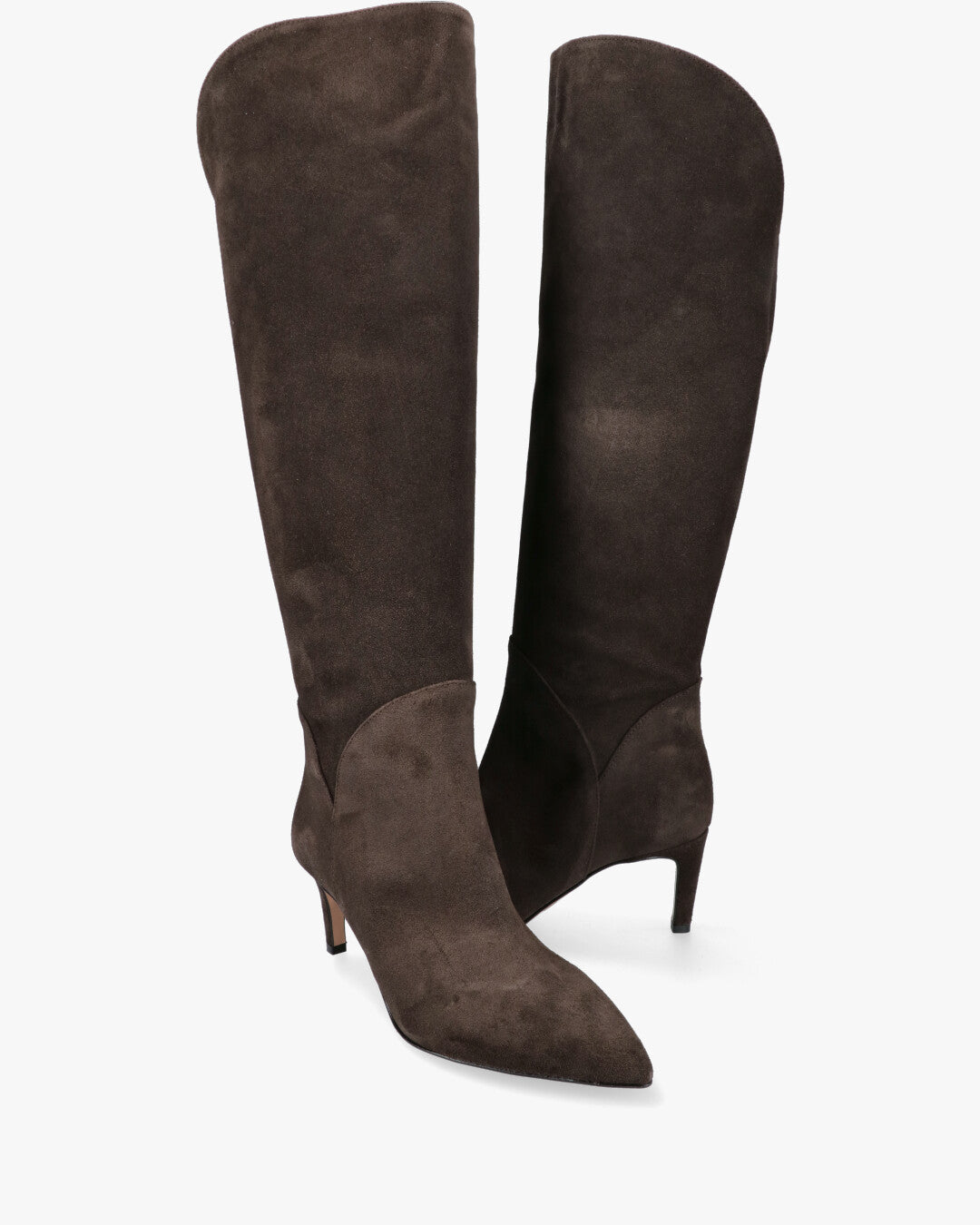 Modello: Stivali alti al ginocchio. Tomaia in pelle scamosciata (suede) color marrone scuro (caffè).Design: Silhouette affusolata con punta sfilata.Gamba: Gambale morbido aubo con forma svasata alla sommità.Tacco: Tacco a spillo basso/medio. vestibilità .Ideale per: look invernali ed eleganti, da indossare sopra o sotto i vestiti.