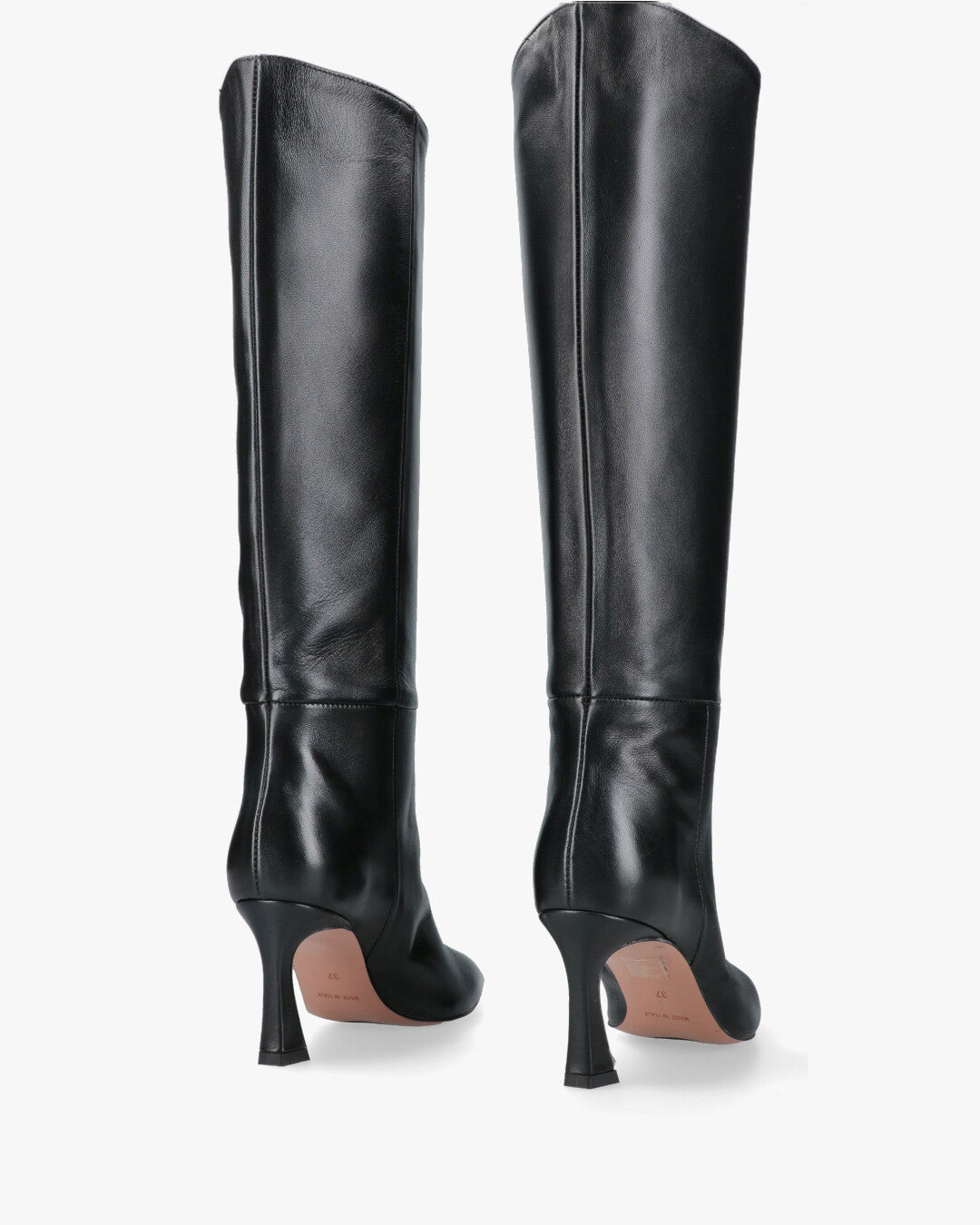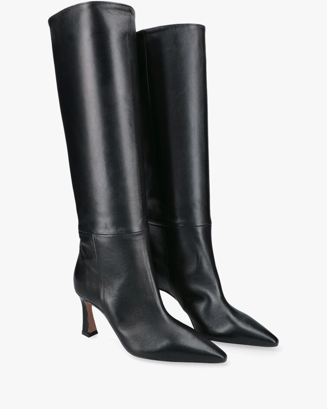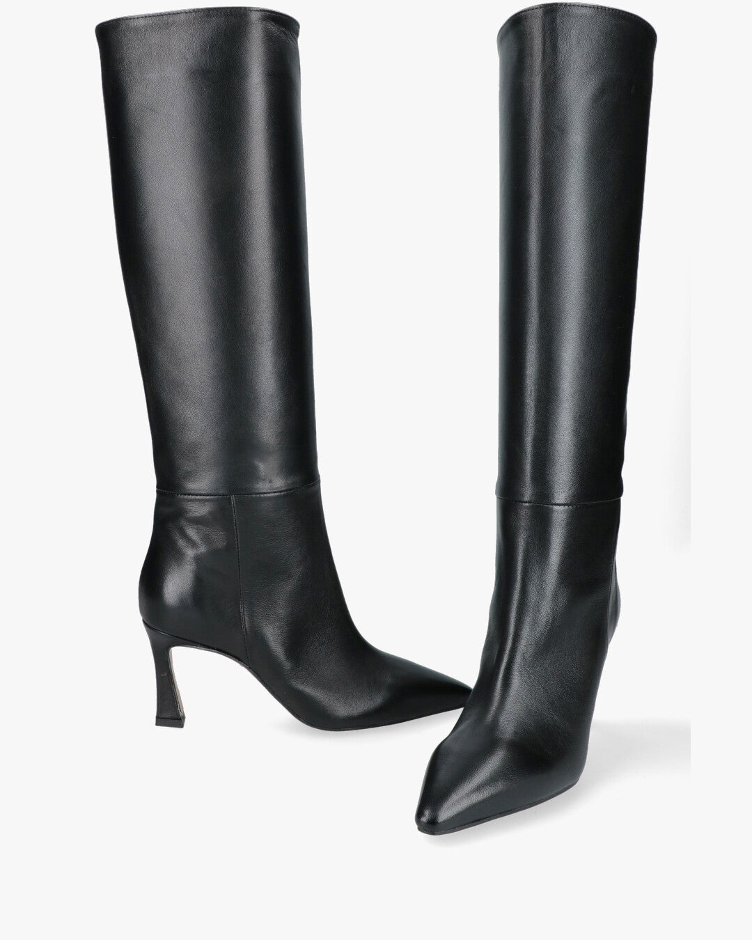 Materiale: Pelle Colore: neroPunta: affusolataTacco: svasato, circa 7–8 cmAltezza gambale: al ginocchioFodera interna in pelleSuola in cuoioCalzata comoda, senza chiusura
