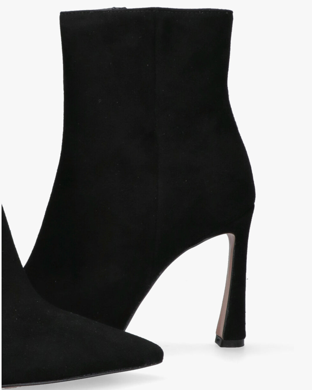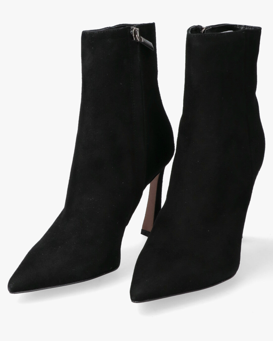Stivaletto Elegante a Tacco Alto in Camoscio (BD-R915)Design: Stivaletto (Ankle Boot) dal profilo slanciato ed elegante, con punta affusolata e tacco alto svasato.Colore: Profondo e versatile Nero Monocromatico.Materiali: Tomaia in pregiato camoscio (suede), che conferisce un look sofisticato e una texture morbida.Tacco: Tacco alto e sottile (a clessidra/rocchetto) di circa 9-10 cm, che slancia la figura.Chiusura: Pratica cerniera lampo color argento (o metallo) sul lato interno del gambale per una calzata facile.Stile: Perfetto per serate, eventi eleganti o per elevare un look da ufficio chic e moderno.Vestibilità: Altezza alla caviglia che si abbina perfettamente sia con pantaloni cropped che con gonne e vestiti.