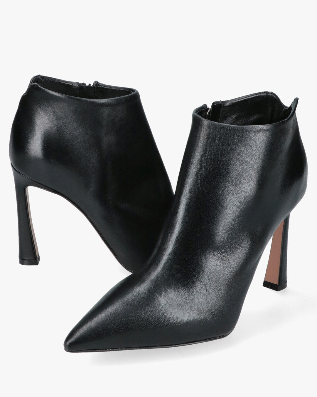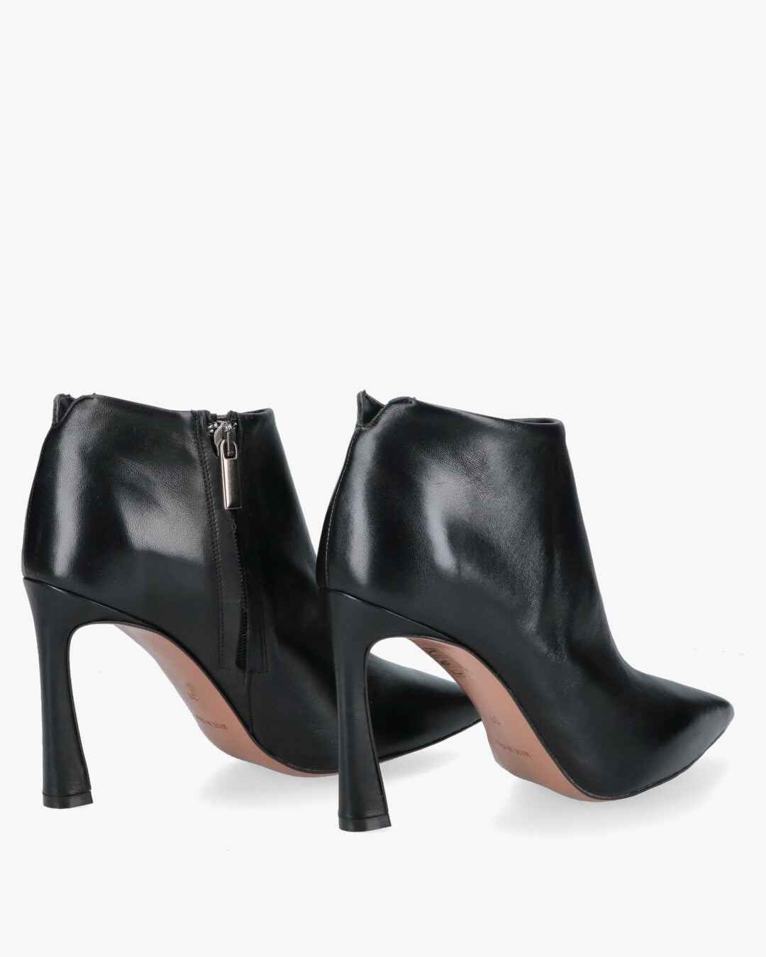 Modello: Stivaletti alla caviglia (Ankle Boots).Materiale: Tomaia in pelle liscia di colore nero.Design: Linea pulita e affusolata con scollatura curva sul collo del piede.Punta: Punta estremamente sfilata e appuntita.Tacco: Tacco alto a rocchetto (o svasato), che aggiunge stabilità e un tocco di design moderno.Chiusura: Cerniera in metallo visibile sul retro del tallone.Ideale per: Abbinamenti eleganti da ufficio o per serate, perfetti con pantaloni cropped o gonne.