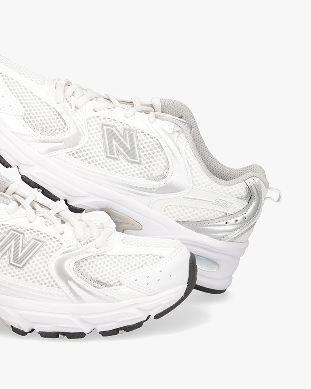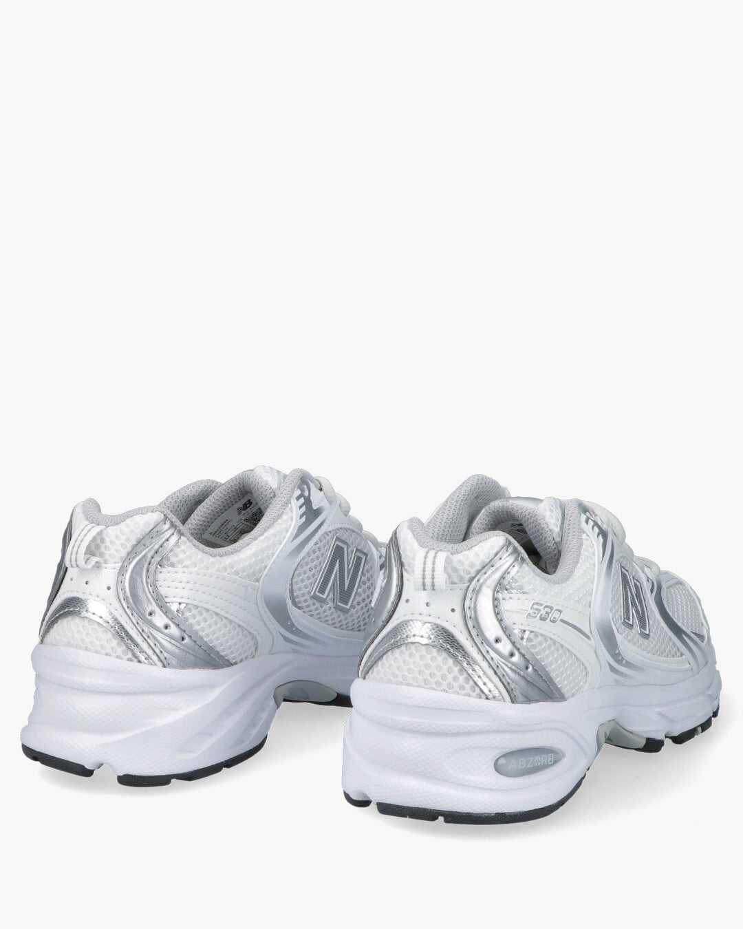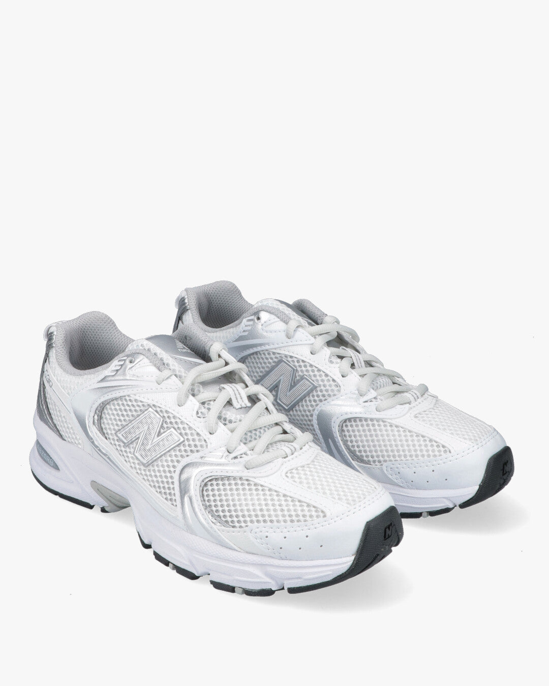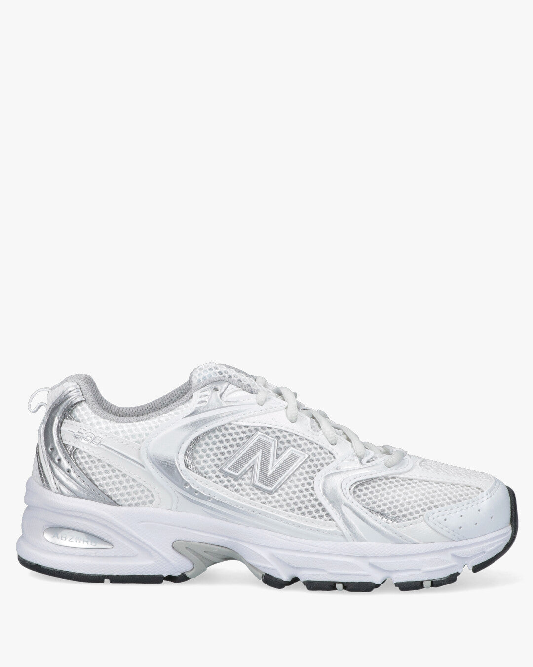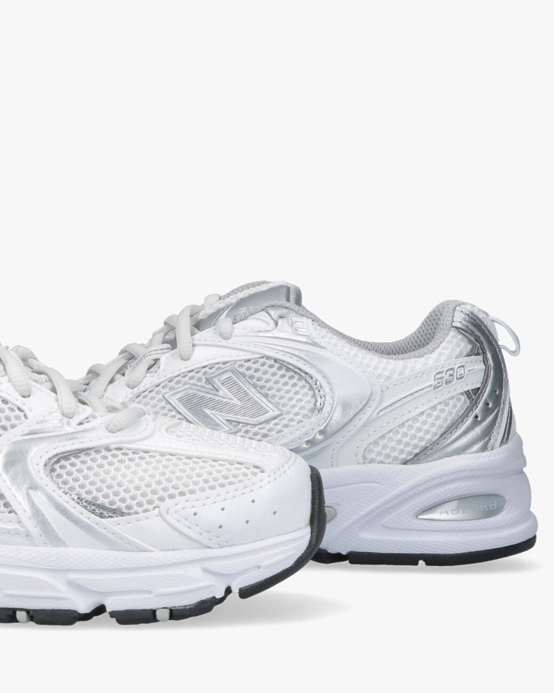 Sneaker New Balance modello MR530 realizzata tessuto tecnico a trama larga bianco con riporti in pele laminata argento. logo laterale bianco argento, lacci in cotone bianco. Fondo in gomma ABZORB, per un comfort di livello superiore.