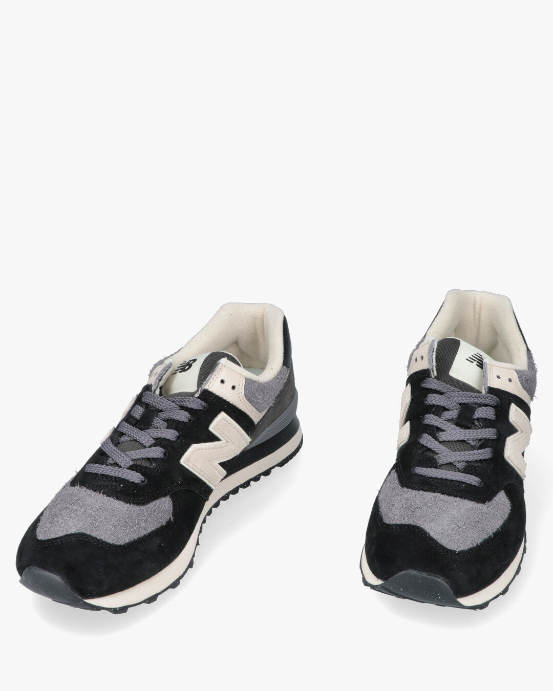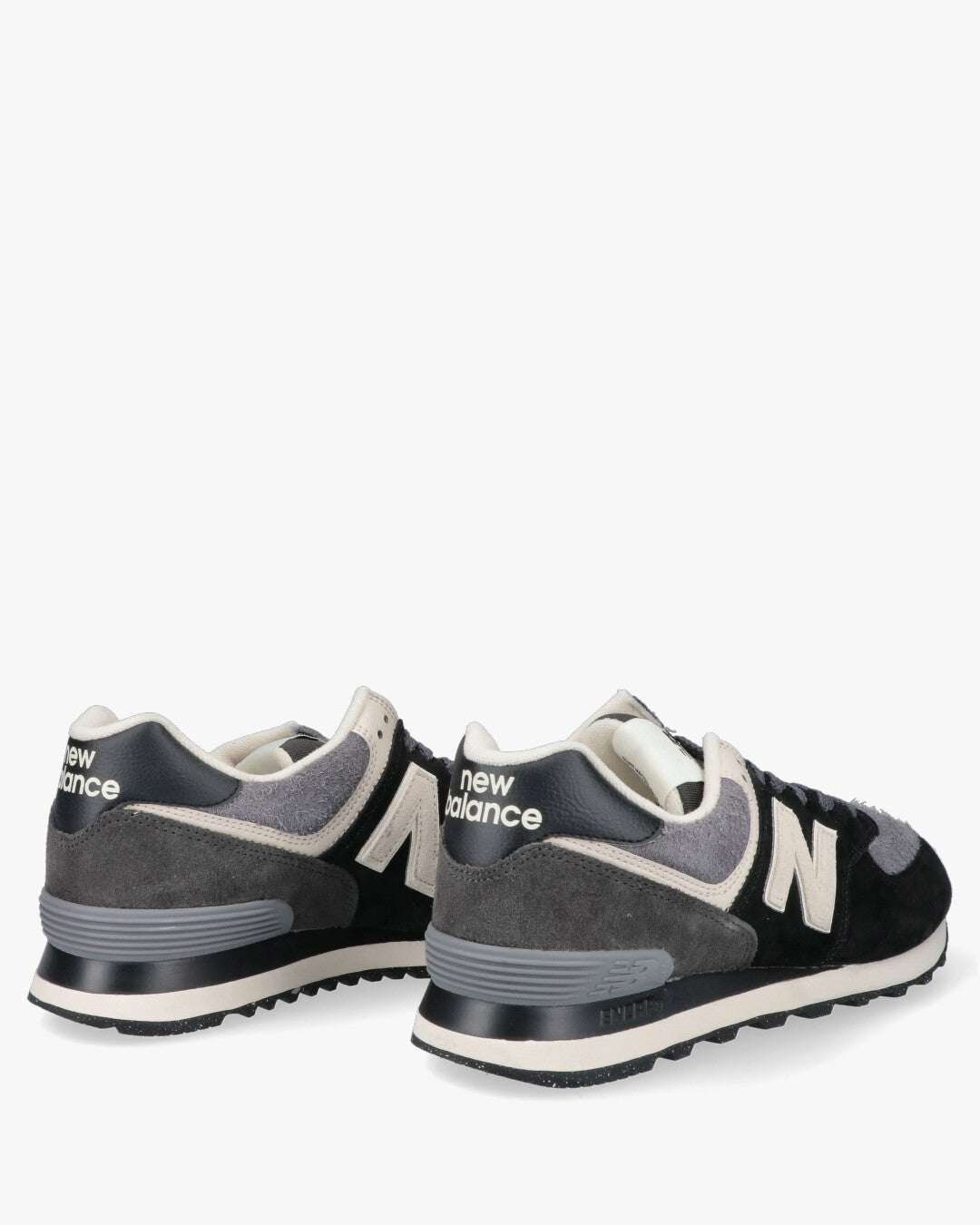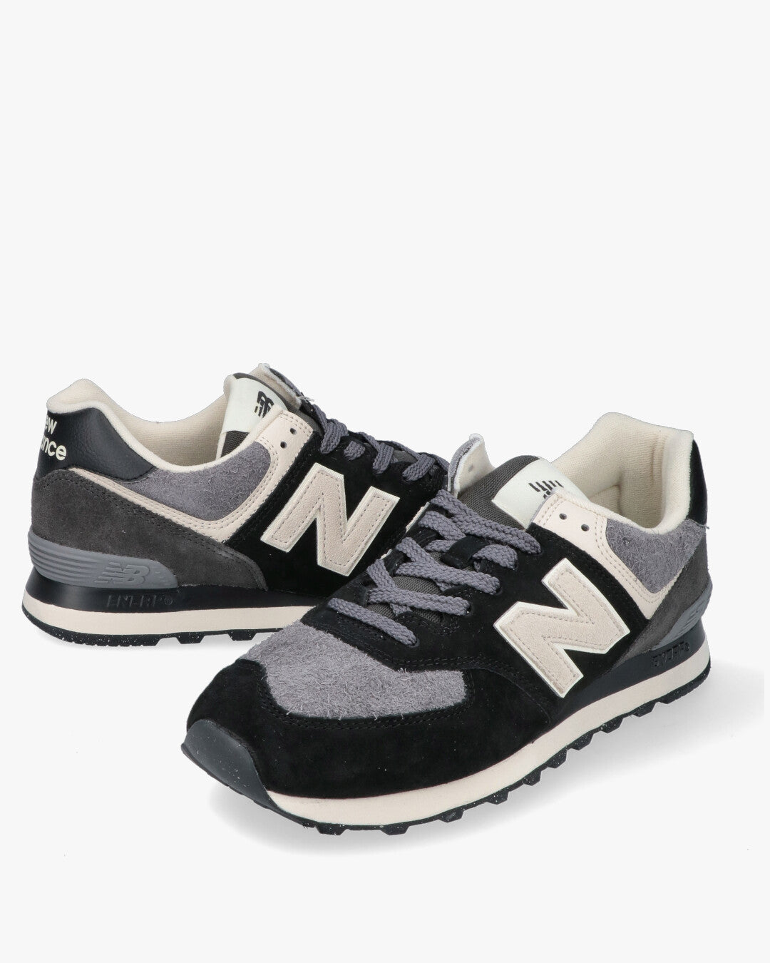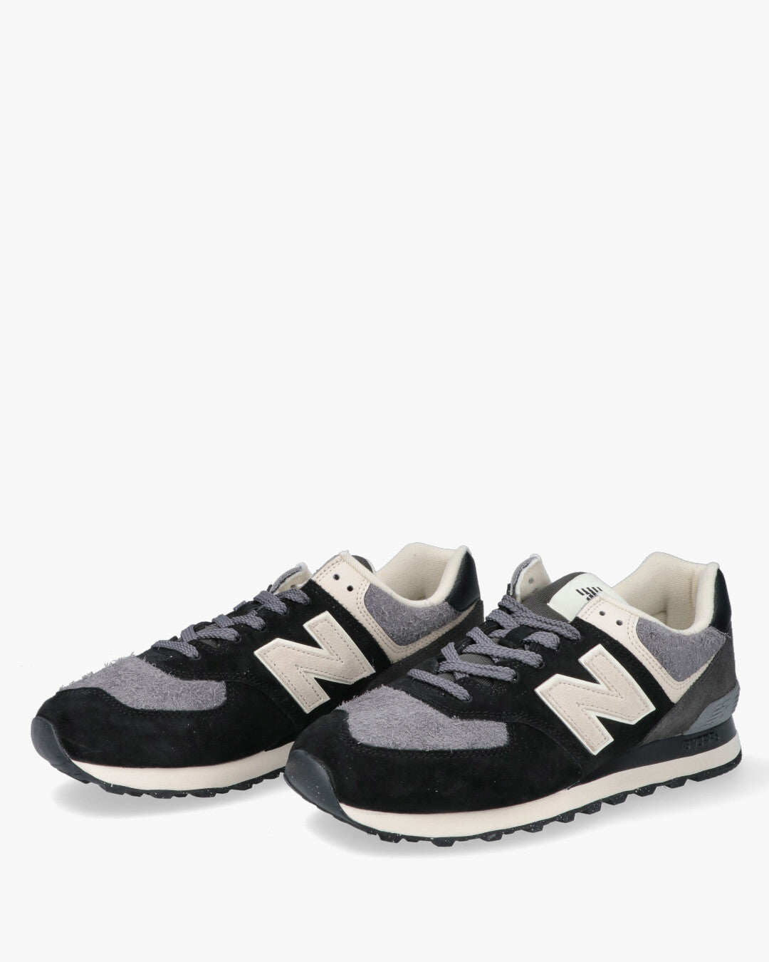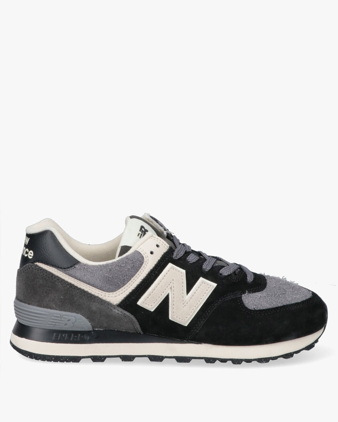 Modello: New Balance 574, un'icona del brand e modello lifestyle per eccellenza.Materiali: Tomaia robusta e confortevole in camoscio (suede) e inserti in tessuto.Colorazione: Combinazione bicolore versatile in Nero, varie tonalità di Grigio e dettagli Beige/Bianco sporco.Ammortizzazione: Tecnologia dell'intersuola per offrire supporto, stabilità e la massima durevolezza.Design: Silhouette classica da running anni 80/90, aggiornata per il look urbano.Dettagli: Grande logo a contrasto sul lato e logo New Balance sul tallone.Suola: Suola esterna in gomma resistente, ideale per l'uso quotidiano.Ideale per: Completare un look casual e sportivo con un tocco retrò e grande comfort.